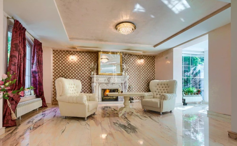 • първи етаж (230 кв.м): просторно антре, слънчева дневна със зимна градина и великолепна мраморна камина – реплика на камината в замъка "Балморал". На същия етаж се намират трапезария, кът за кафе, кухня в аристократичен ретро стил с осветителни тела Bohemia и Swarovski, както и баня за гости в изискано черно-златно Versace оформление. От дневната има директен достъп към двора.