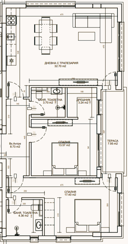 Апартаментът е 117,35 кв.м. със следното разпределение: антре, дневна с кухненски бокс, две спални, от които едната има собствена баня с тоалетна и дрешник, отделна баня с тоалетна и тераса.