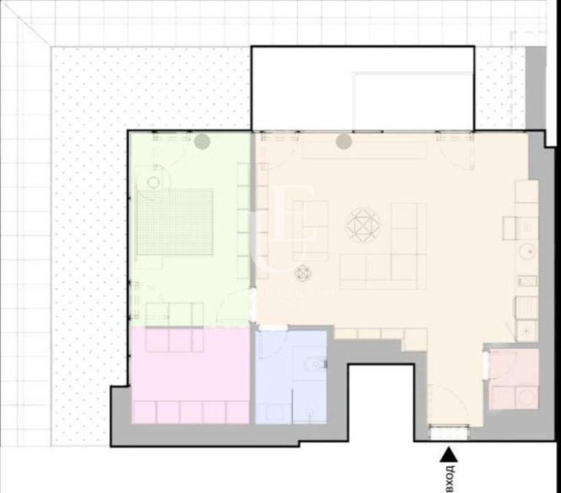 Разпределението на имота включва входно антре, хол с кухня, голяма спалня с дрешник, баня с тоалетна и голяма хубава тераса към всекидневната Цената е без включен ДДС. Ref. ID:23266