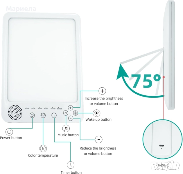 Таймер и функция за автоматично събуждане: Нашата лампа за светлинна терапия има 6 настройки на таймера, можете да избирате 10/20/30/40/50/60 минути. Можете също да настроите функцията за автоматично събуждане, за да си осигурите естествена среда, в която да се събуждате със слънчева светлина + бял шум и да се наслаждавате на всеки ден.