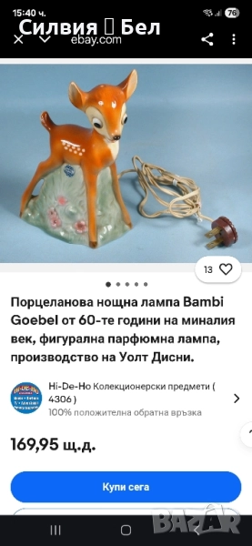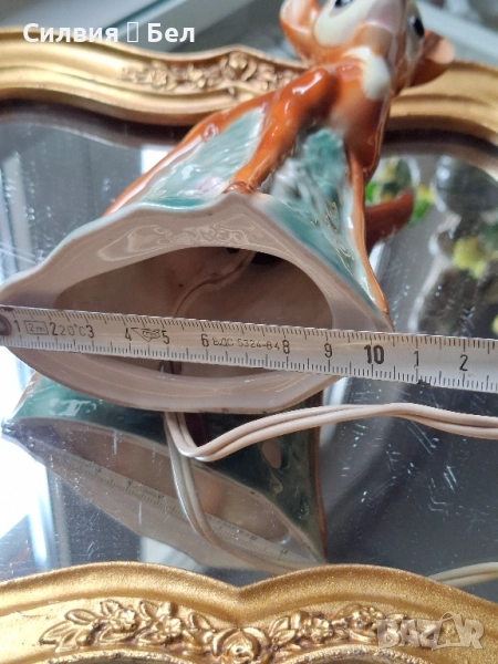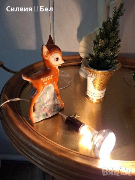 Винтидж порцеланова лампа Goebel – 🦌 Бамби Очарователна порцеланова лампа от марката Goebel (Германия), с дизайн на малко 🦌. Ръчно рисувани детайли, нежни глазури и цветни акценти в основата. Период: средата на XX век Материал: порцелан Състояние: отлично, без пукнатини или отчупвания. Работи (кабелът е оригинален) Трябва да се постави подходящият размер крушка, която да се побира във лампата. Красив и рядък винтидж акцент за колекционери или за стилен интериор. Този тип лампи са били много популярни в средата на миналия век и са чудесен акцент за винтидж декор, детска стая или колекция от ретро предмети. Лампата излъчва мека, топла светлина. Цена 1️⃣9️⃣0️⃣лв./97,14€ •✽✧✽•°”˜🦌”°•✽✧✽•°”˜🦌”°•✽✧✽•°”˜🦌”°•✽✧✽•°”🦌˜”°•✽✧✽•