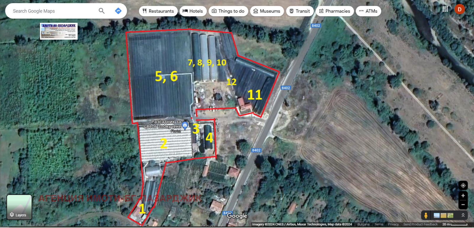 Имоти-БГ-Пазарджик продава разработен цветарски бизнес, разположен върху 20841кв.м, ведно с построените сгради с обща площ от 578кв.м, в които са разположени оранжерии-остъклени и неостъклени с площ от 1844кв.м, помощни сгради, съоръжения, офиси и др.Професионално видеонаблюдение 24/7, трифазен и монофазен ток, работещ сондаж, два броя котли, на твърдо гориво, капково напояване, поливна инсталация плюс самостоятелни сгради за офиси и складове с навеси.Агенцията разполага с всички документи относно продаваемостта на бизнесимота.За подробности на тел.0877909056