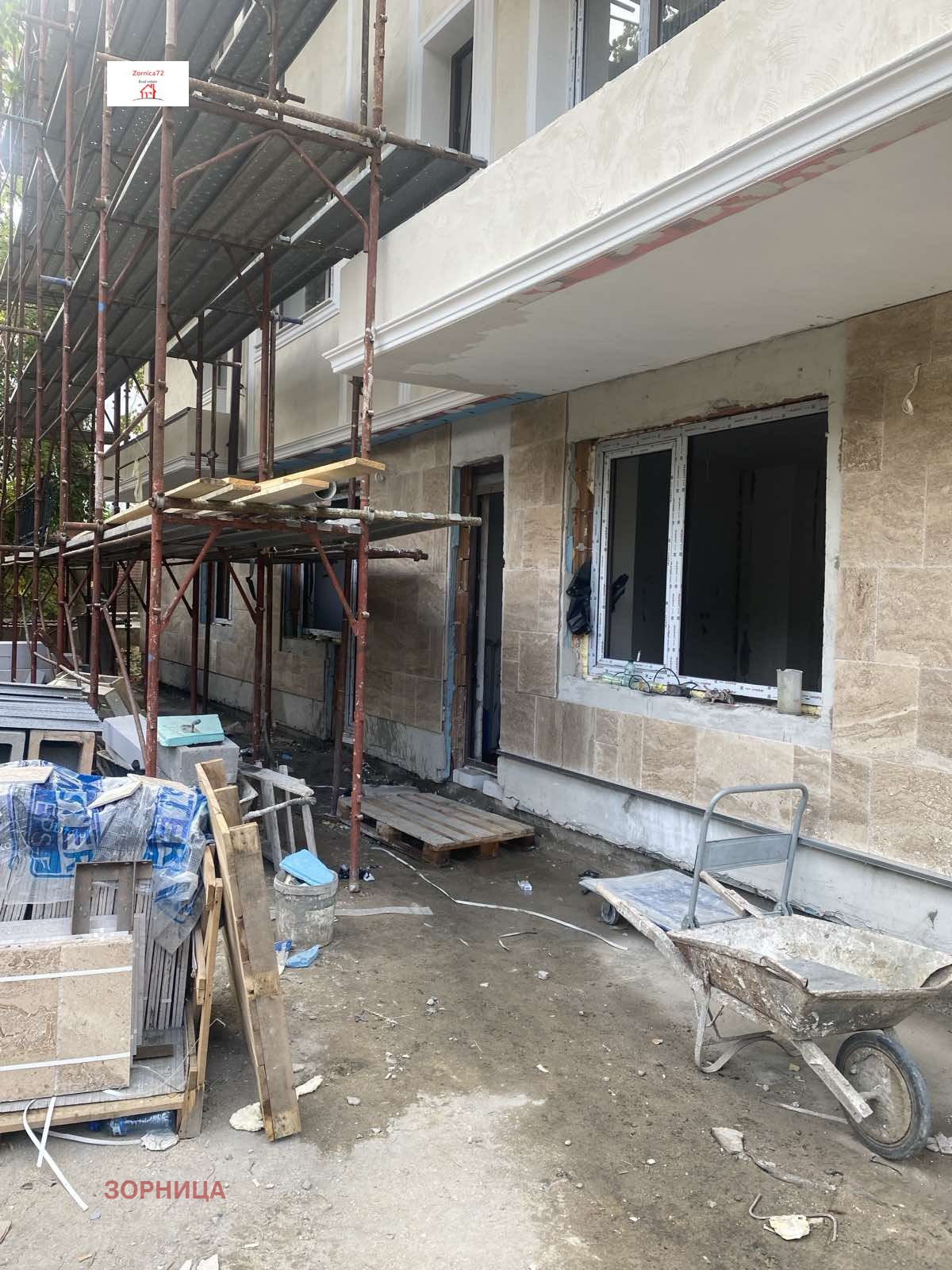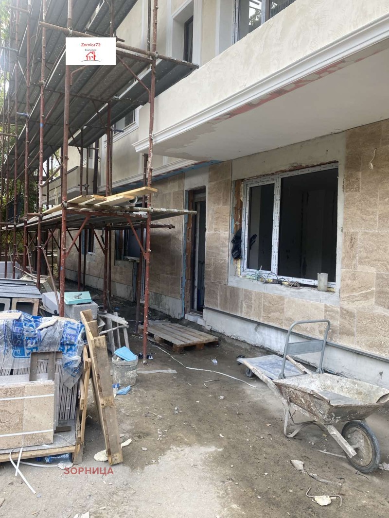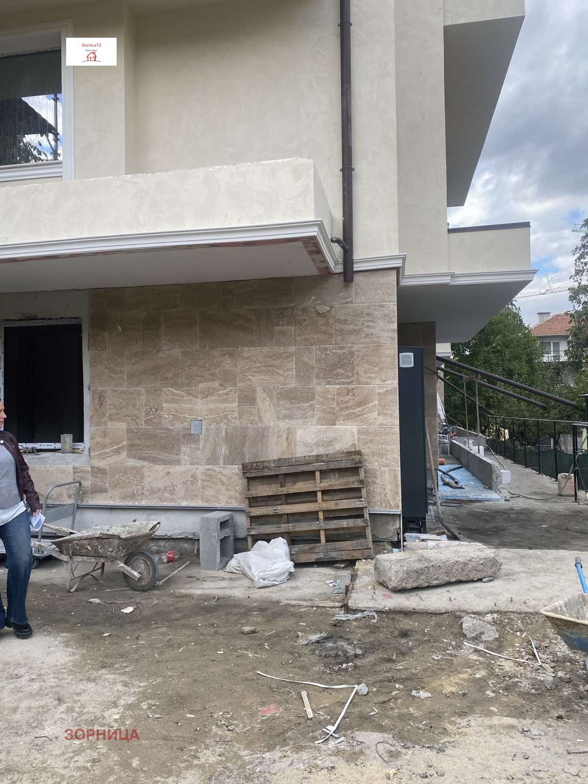 ЕКСКЛУЗИВНИ ПРАВА!ПОДЗЕМЕН ГАРАЖ.Апартамент 5 е от обезщетен собственик на земя,танамира се на ул.Райска градина 32,много удобна локация,на пет минути пеша от трамвайни спирки,бърз достъп до околовръстен път.В цената влизат луксозни довършителни работи,като се предоставя възможност за избор от определен доставчик,където е направена оферта на собственика.Довършителните работи включват:подови настилки ламинат и гранитогрес,баня изцяло завършена и оборудвана с моноблок,шкаф с умивалник,душ батерия.Ще бъдат монтирани алуминиеви радиатори.Изградена е газова инсталация.Състои се от голяма дневна,две самостоятелни спални,баня с тоалетна,склад,и дворна тераса 14,25кв.м.,застроена площ без терасата 77 кв.м.Качествено изпълнение на сградата,с интересна визия,отличаваща се оригинално архитектурно решение.Предлага се и голям подземен гараж,който е с нужната височина за два автомобила,ако се монтира рампа на цена 35000 евро.Сградата е със замерен акт 15,срок за въвеждане в експлоатация-ноември 2025г.За огледи и информация-Цветанова-0887401414.