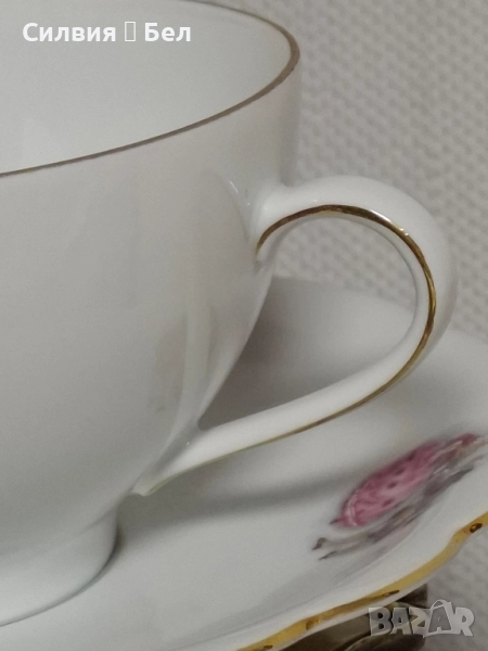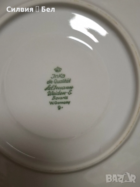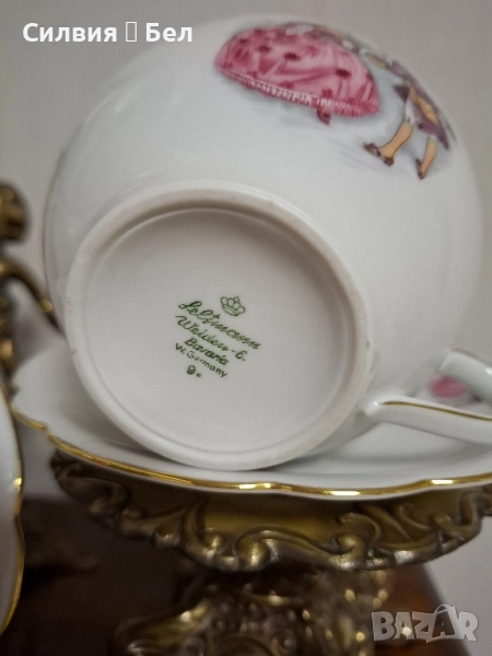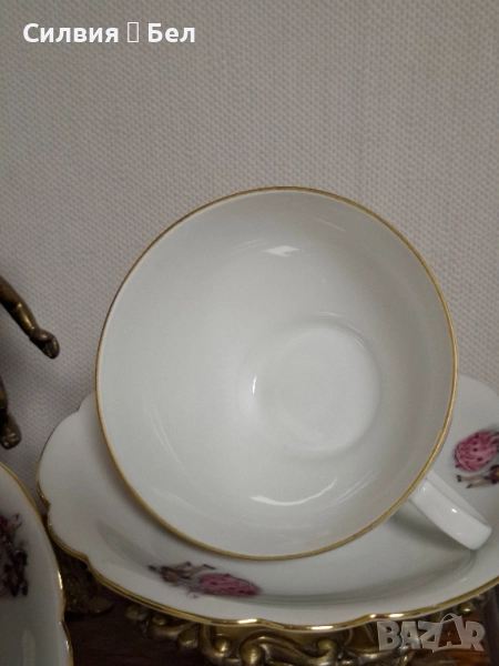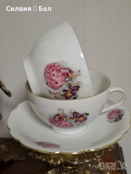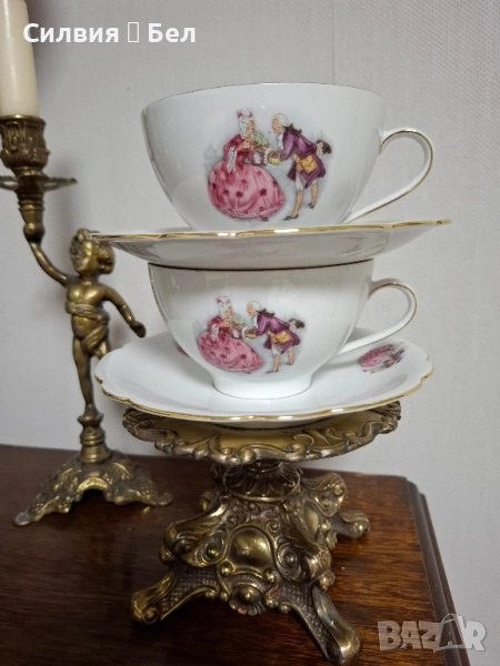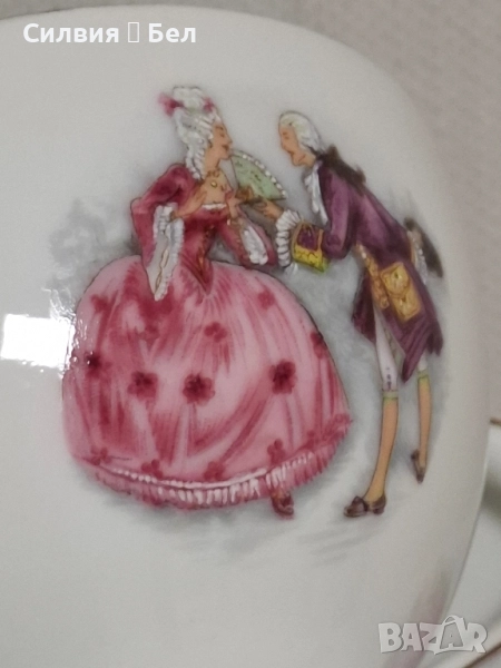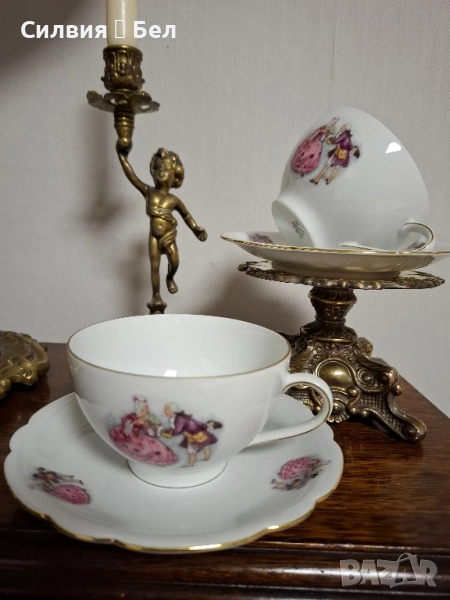 Винтидж Комплект: Порцеланови Чаши и Чинийки с Галантни Сцени от Бавария Потопете се в очарованието на отминала епоха с този изискан винтидж комплект за двама. Тет-А-Тет. Тези произведения от порцелан носят духа на галантната епоха, изобразявайки нежни кавалери и дами в пищни рокли, които сякаш танцуват или си разменят тайни усмивки в парка.🙂 Финият бял порцелан е украсен с изящен златен кант по ръба, който придава блясък и допълва луксозното им излъчване. Чинийкиъе са с вълнообразен позлатен ръб. Комплектът е произведен от известната немска фабрика Seltmann C., Weiden, Бавария в периода на Западна Германия (W. Germany), което го прави автентичен колекционерски предмет с историческа стойност. Всяка глътка чай, или горещ шоколад от тази чаша ще бъде като малко пътешествие във времето, носещо усещане за романтика, елегантност и аристократичност. Фини трансферни изображения на романтични/галантни сцени, златен кант. Състояние: Отлично винтидж състояние за годините си. Подходящ за: Колекционери на европейски порцелан, любители на романтичния и аристократичен стил, или като специален подарък за любим човек. Подарете си или на някой скъп човек този къс от една красива и романтична история! Размери: Диаметър на чашата 10,4 см Височина 6,4 см Вместимост 260 мл. Диаметър на чинийката 16 см. Обща цена 7️⃣0️⃣лв-35,79 € ღꕥ⊱❥─❥⊱💜✿⊱╮☆♪ ░L░o░V░e░❥─❥⊱💜✿⊱╮💜☆♪ღ💜ღ꧂ღ
