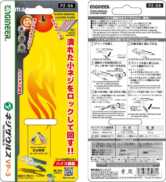 ENGINEER Saurus VP-3 PZ-66 са комбинирани клещи с вертикални канали за бързо освобождаване на повредени и/или ръждясали винтове/болтове или остатъци от тях, клещи чираци, с винт за постоянно затягане на захвата.