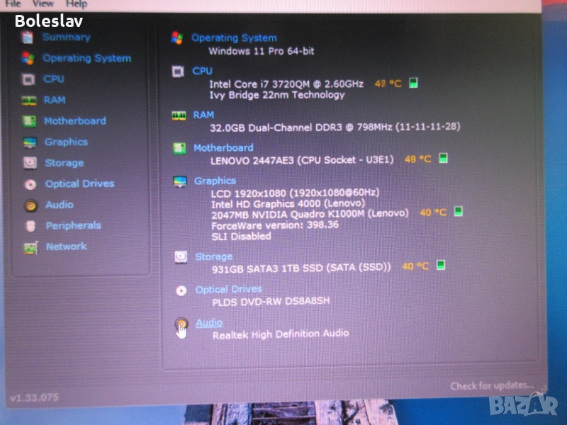 Графична карта: две видеокарти - Intel HD graphics 4000 (1920x1080 , 60HZ) и Nvidia Quadro K1000M 2GB