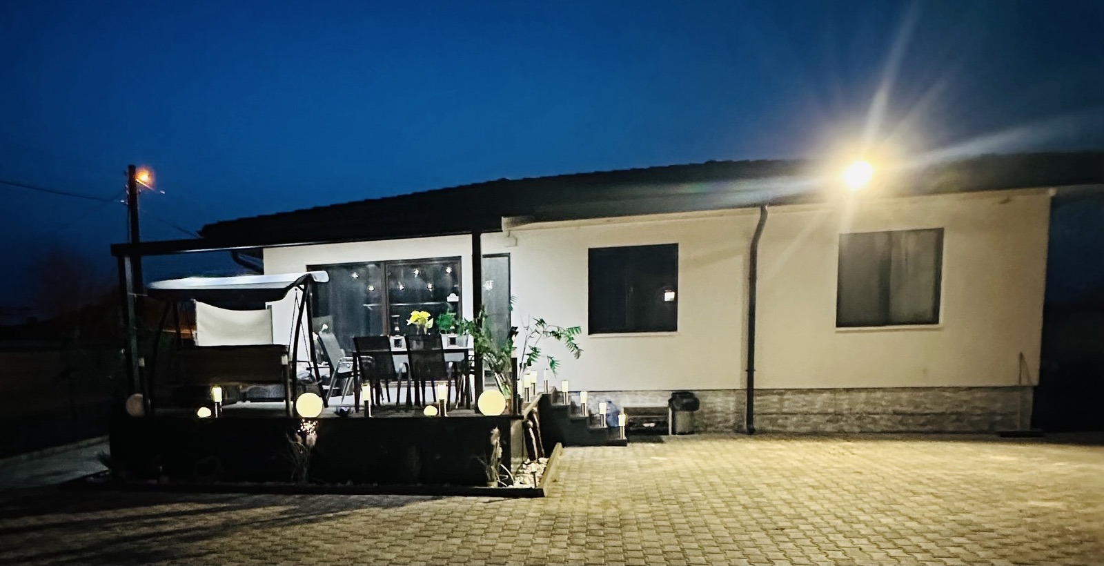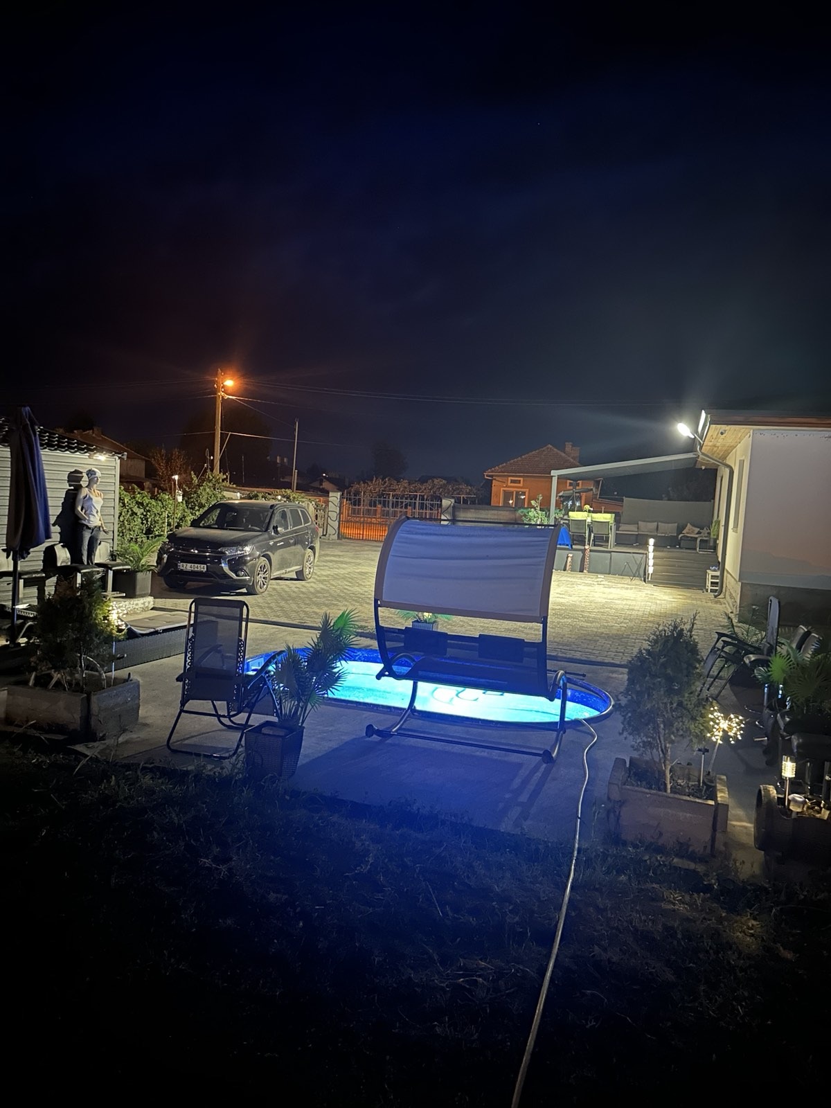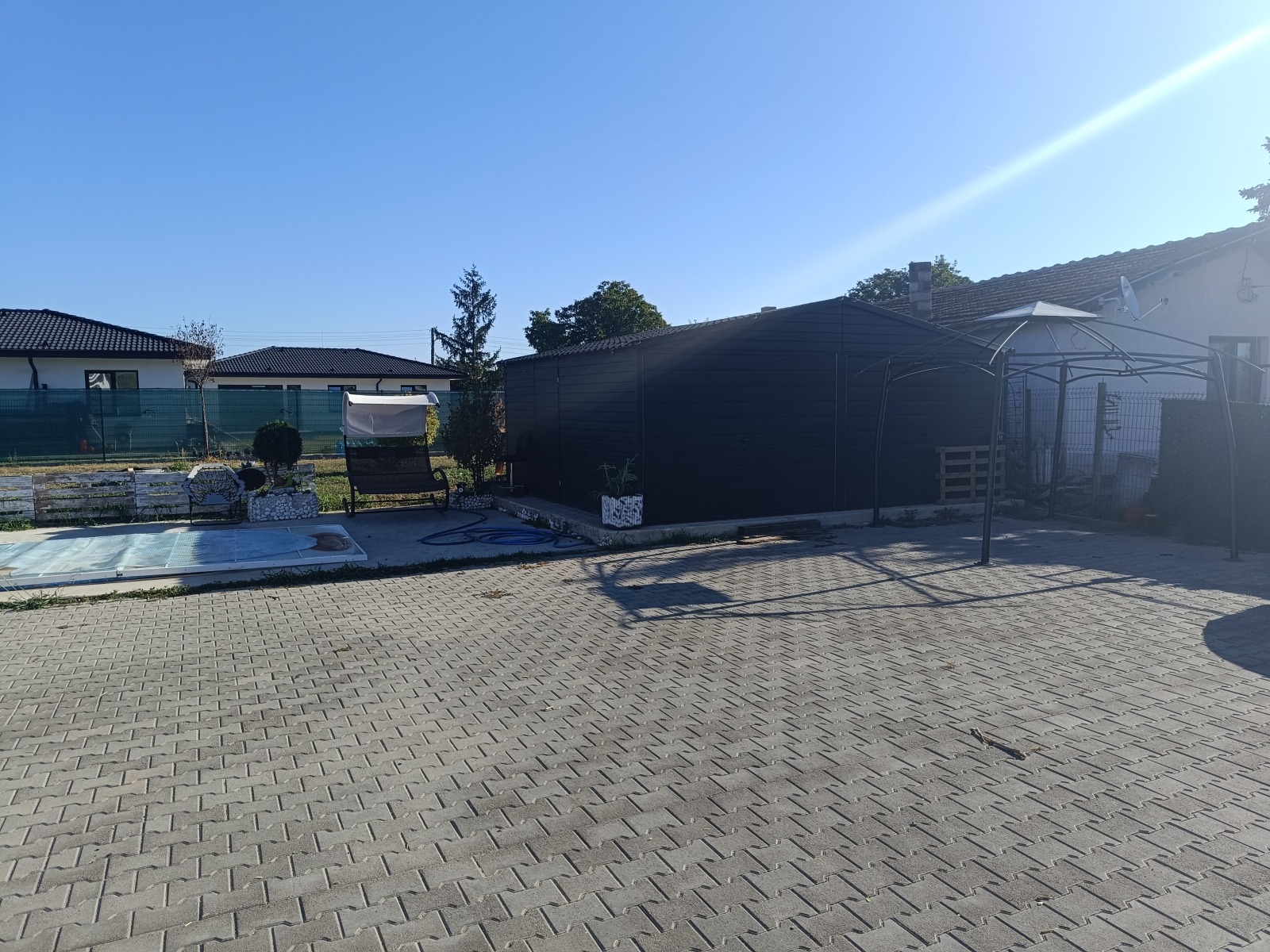 Дворното място, върху което е построена къщата е равно /с изградена септична яма/, оградено, с поставена двойна врата за подход към гаража и паркоместата в него. Също така, за разкош, има изграден басейн /с малки габарити/ в дворното място.
