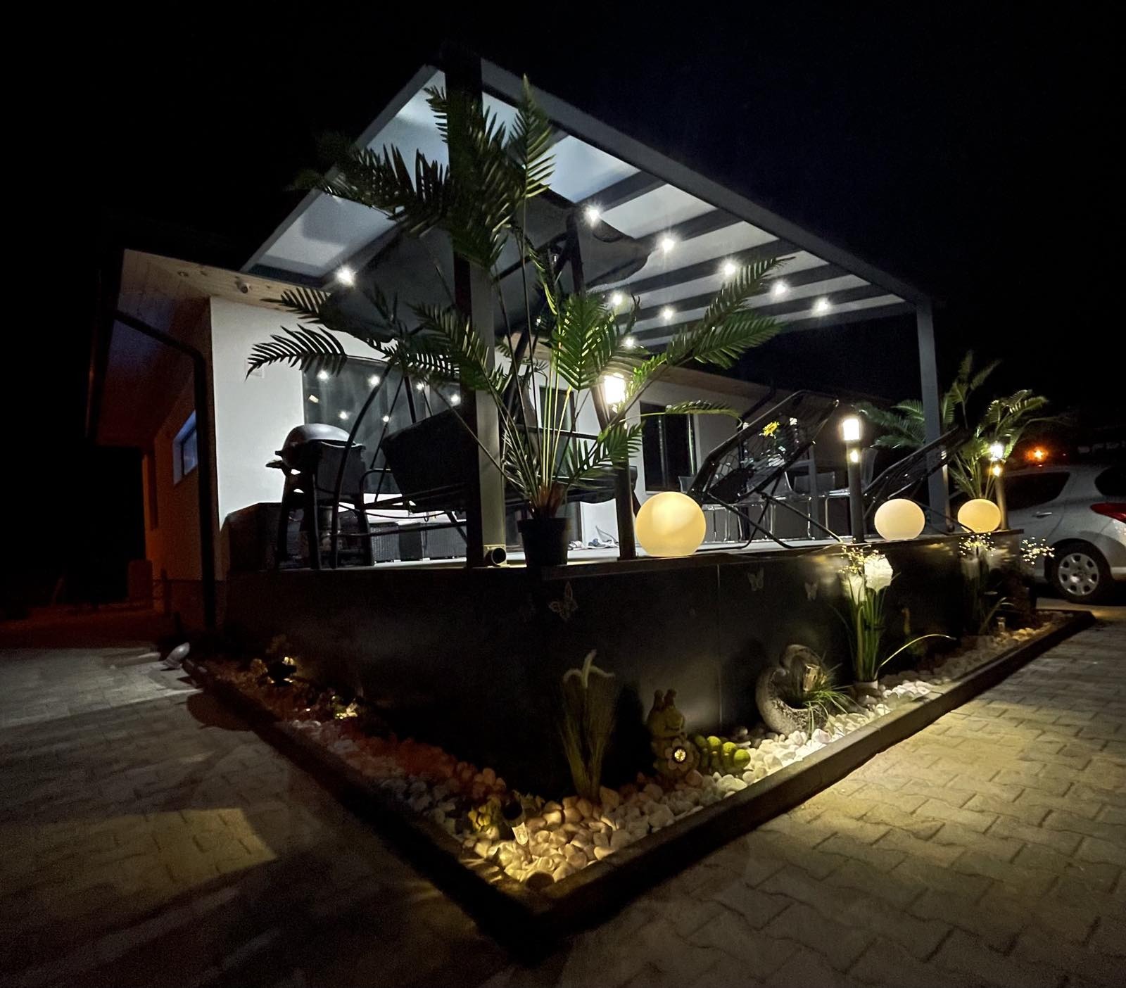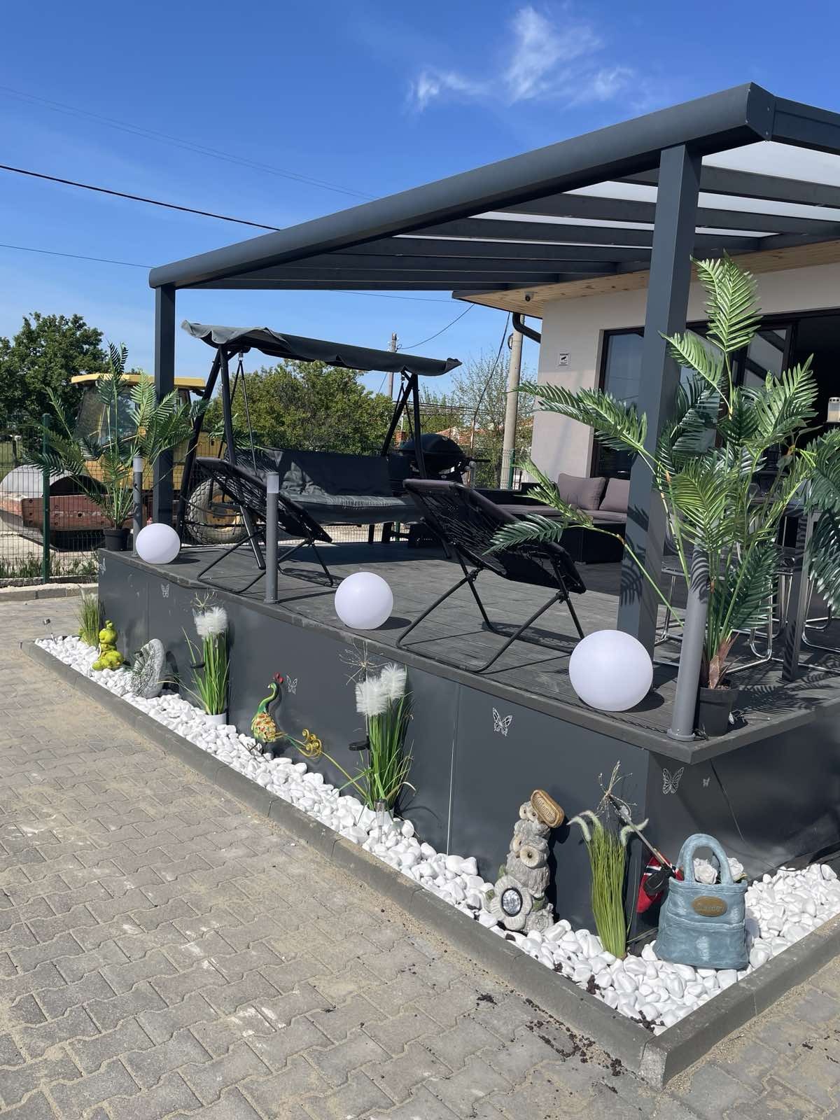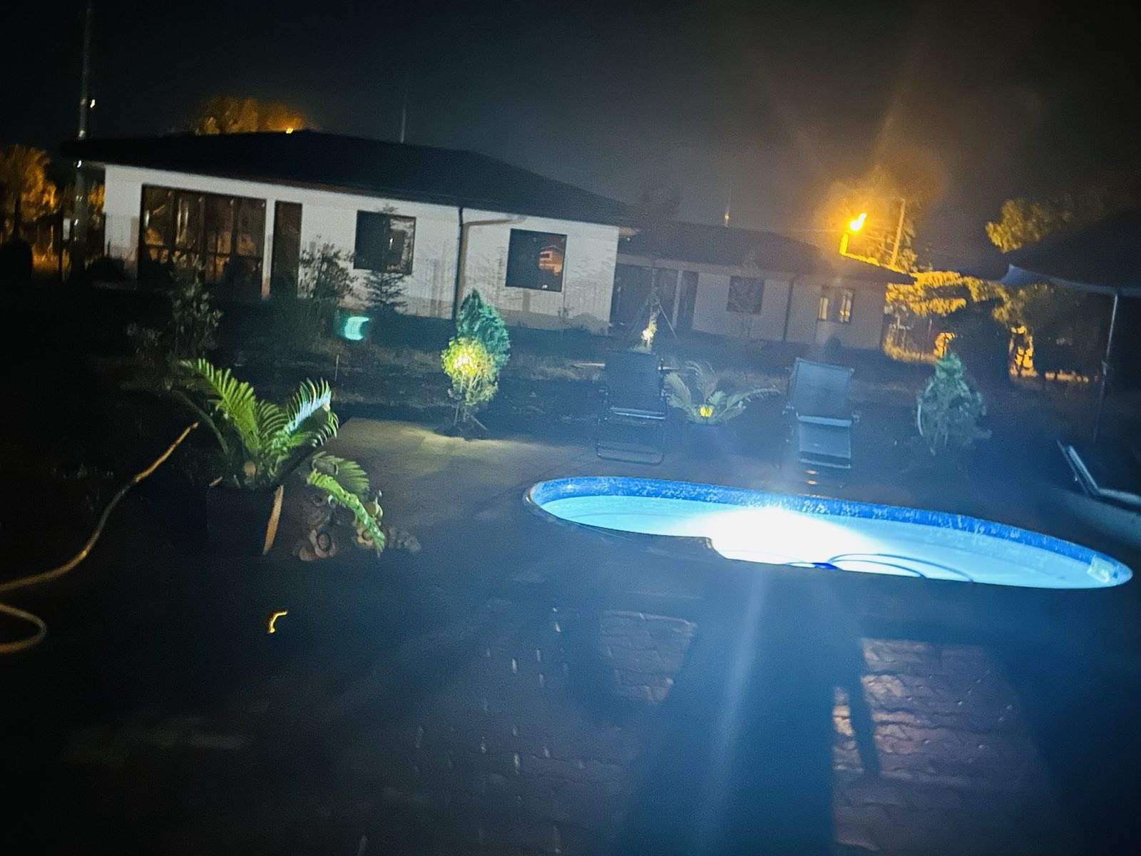Дворното място, върху което е построена къщата е равно /с изградена септична яма/, оградено, с поставена двойна врата за подход към гаража и паркоместата в него. Също така, за разкош, има изграден басейн /с малки габарити/ в дворното място.