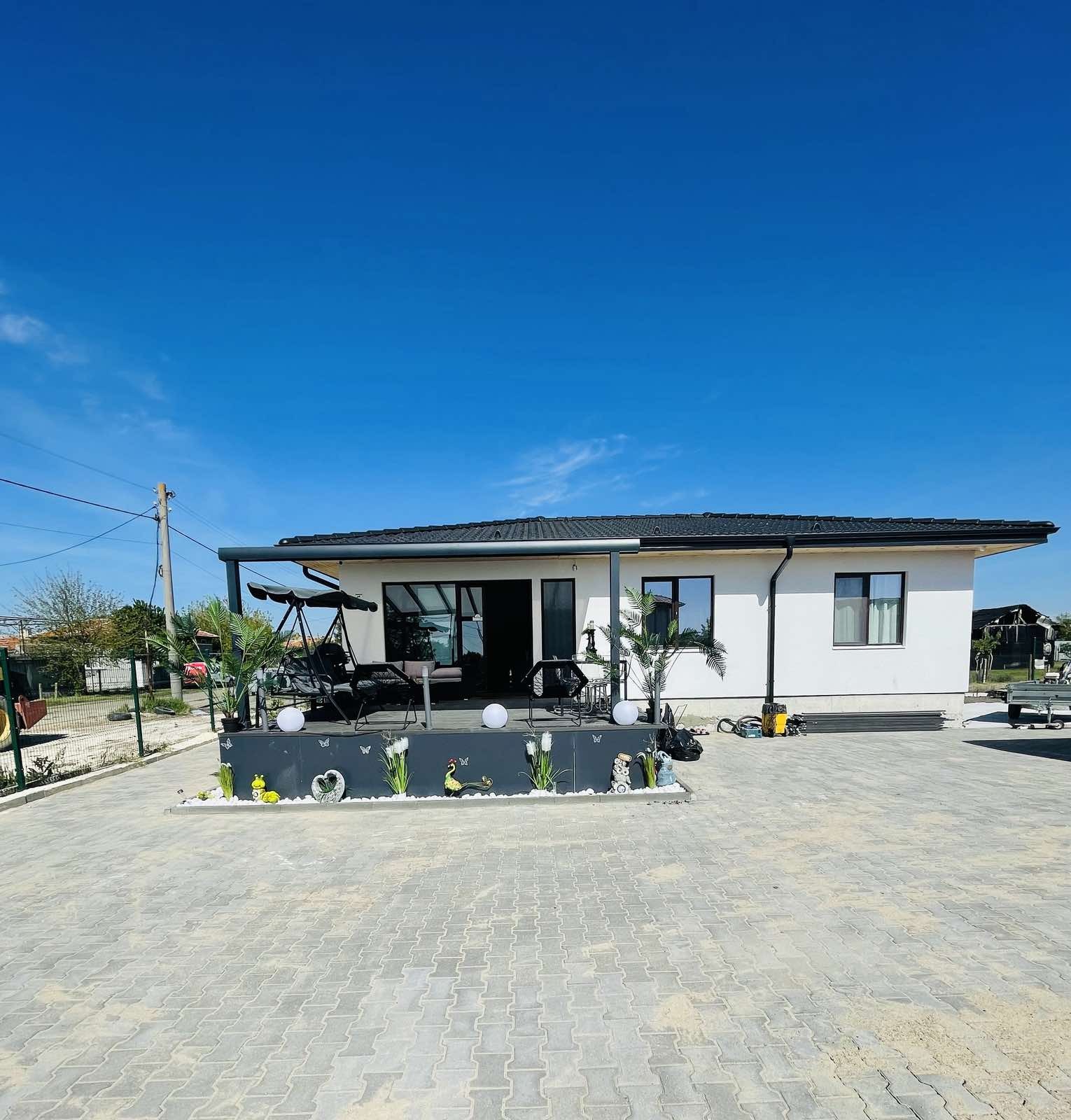 Продава се новопостроена къща на един етаж с площ от 99,60 кв.м., и следното разпределение на застроената площ: просторна Всекидневна 34,10 кв.м., две спални (като към едната има дрешник ) - 1-ва Спалня 18,23 кв.м и Дрешник 5,91 кв.м; 2-ра Спалня 12 кв.м., Баня и тоалетна 6,56 кв.м., Тоалетна 1,84 кв.м., входно Антре 8,70 кв.м., голяма веранда, голям гараж и паркоместа.