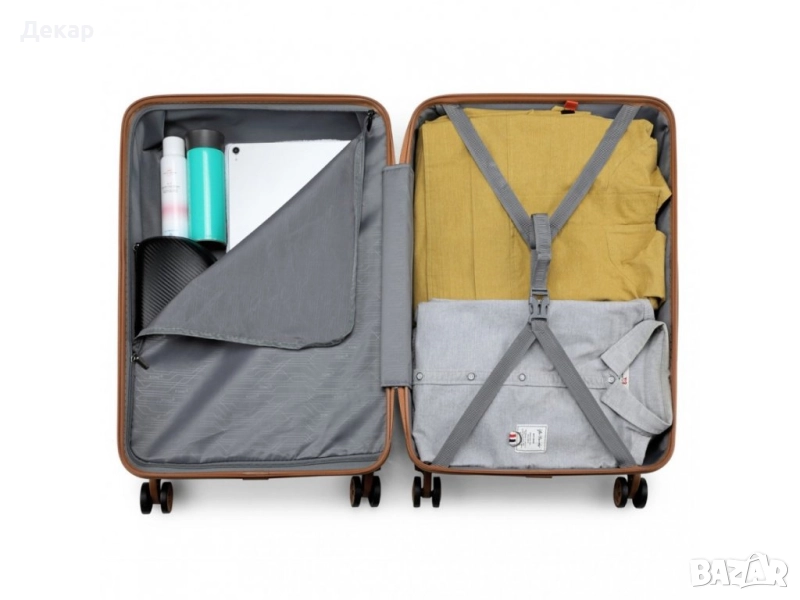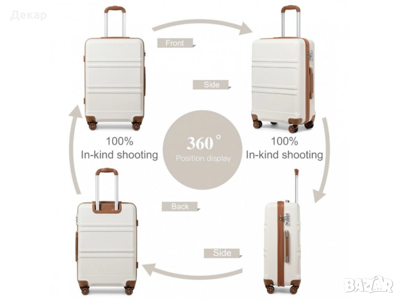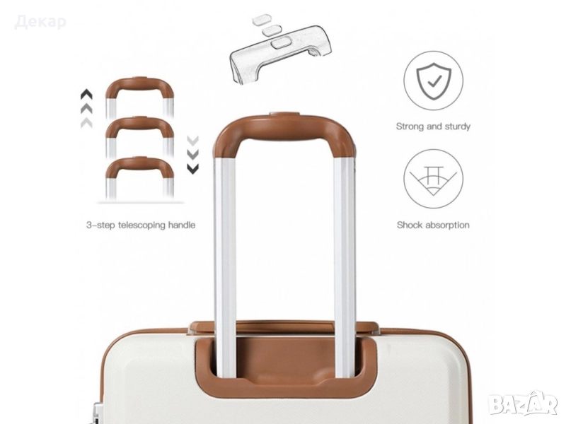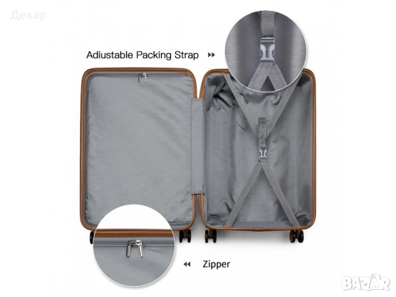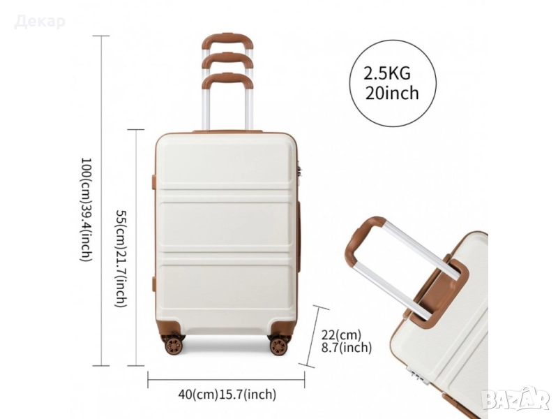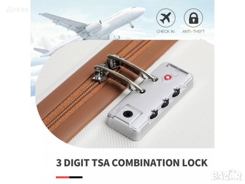 куфара: Здрав материал: Изработен от здрав и издръжлив ABS материал, за да предпази вашите вещи от повреди. Лесно управление: 4 въртящи се на 360° колела позволяват плавно движение на летища, гари и в оживени райони. Телескопична дръжка: Разтегателна алуминиева дръжка с регулируема височина за максимален комфорт при носене. TSA ключалка за сигурност : Здрава 3-цифрена TSA ключалка позволява проверки за сигурност, без да се повреди багажът ви. Практични дръжки: Горните и страничните дръжки улесняват боравенето с куфара. Добре обмислен интериор: Основното отделение е снабдено с каишки за закрепване на съдържанието и разделител с цип за ясна организация на вещите. Странични крачета: Куфарът може лесно да се постави настрани благодарение на стабилните пластмасови крачета. Технически данни: Материал: Външна част: ABS (акрилонитрил бутадиен стирен) Вътрешна част: Полиестерна подплата Хардуер: Сребърни метални детайли, ципове YKK Размери: 55 см (В) x 40 см (Ш) x 22 см (Д) Тегло: 2,46 кг Обем: приблизително 44 литра Поддръжка: Почиствайте само с влажна кърпа. Забележка: Размерите са външни, вътрешните може да се различават с 1-2 см. Как да зададете код за заключване: Ключалката е предварително настроена на „000“ . Натиснете бутона за нулиране (с помощта на химикалка или клечка за зъби). Променете трите цифри на желания код. Отпуснете бутона за нулиране – новият код е зададен.