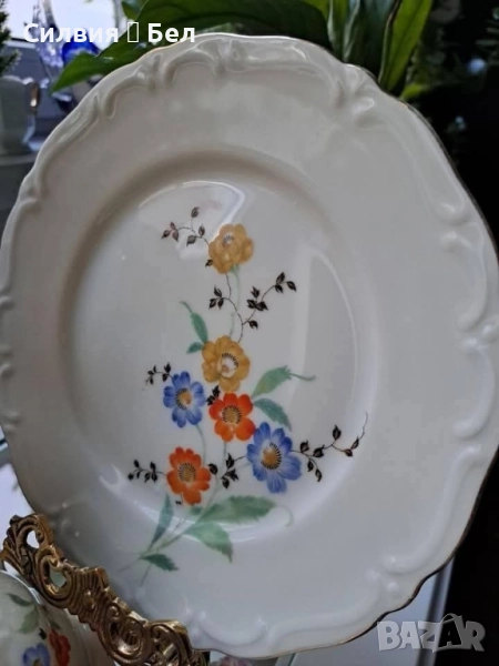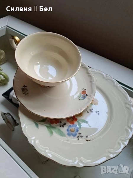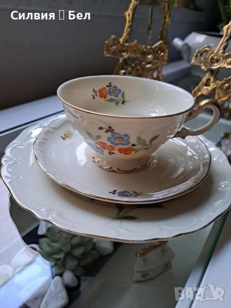 Троен сет за чай. Германия Тюрингия. FELDA RHÖN Размери: ♦️ Десертна чиния :19,5см. ♦️ Подложна чиния: 14,5см. ♦️ Вместимост на чашата 200мл. Цвят на порцелана: слонова кост. Декор: цветя. Бароков релеф и златен кант.