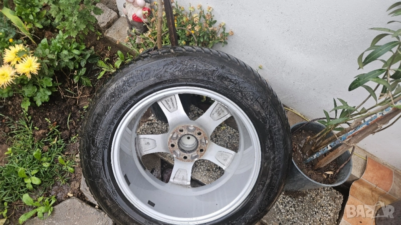 Гуми с джанти. Джантите са 17" 5х114,3 , мисля че са за японски автомобили - Нисан, Сузуки, Хонда, Тойота. В момента са със втулка преход от 70мм към 66,1мм и сега са монтирани на Рено. Междуболтово разстояние 5х114,3мм. ЕТ40. Гумите са 215 65 17 99H