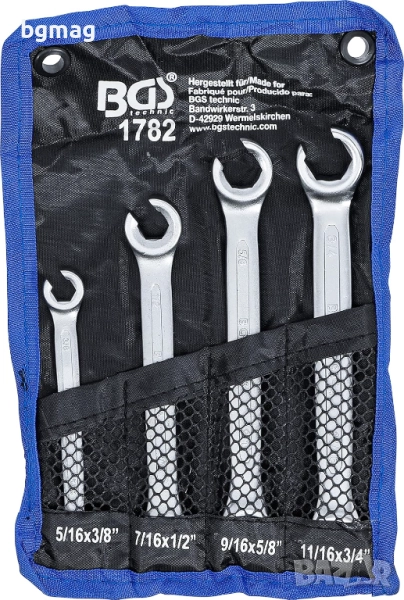 BGS 1782 комплект отворени звездообразни ключове, отклонени на 15°, инчови размери, комплект от 4 броя/ключа, подходящи за тръбни съединения и щуцери.