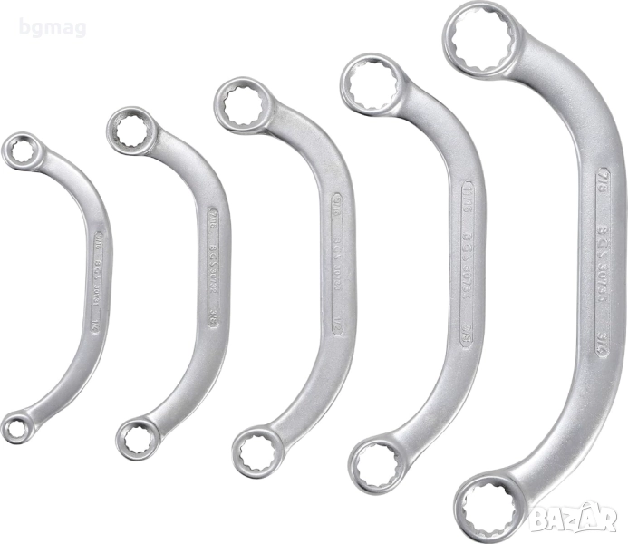 BGS 1222 комплект звездогачени ключове, с огънат "С" образен профил, сребристо/черно, комплект от 5 части/ключа, 1/4-7/8-инча. "Почти" идеален инструмент за труднодостъпни места, благодарение не "С" образния си профил може да монтирате гйка и "зад ъгъла". Инчовите инструменти - най-масовите в поддържането на авиационна техника.