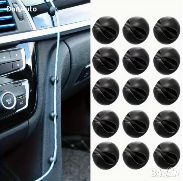 Комплект от 20 практични клипса за кабели, изработени от издръжлива пластмаса, специално проектирани за поддържане на ред в автомобила. Те осигуряват стабилно закрепване на слушалки, зарядни и други кабели върху таблото или интериора, предотвратявайки заплитане и разсейване по време на шофиране.