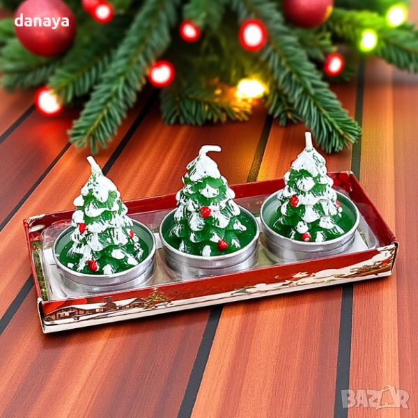 Комплект от 3 коледни чаени свещички елхички – идеално допълнение за всяка коледна украса у дома, офис, ресторант или хотел. Тези коледни свещи във форма на елха са подходящи за поставяне върху празнична трапеза, камина, коледен венец или свещник.