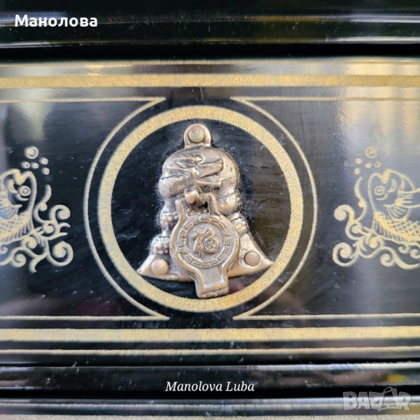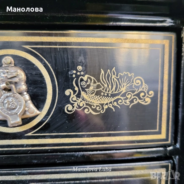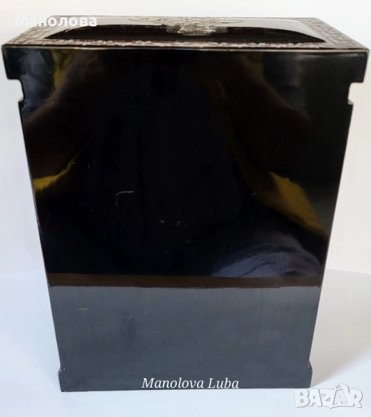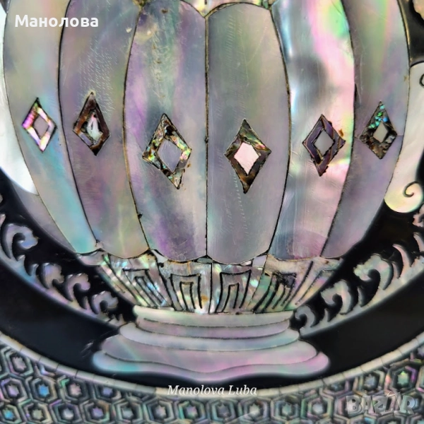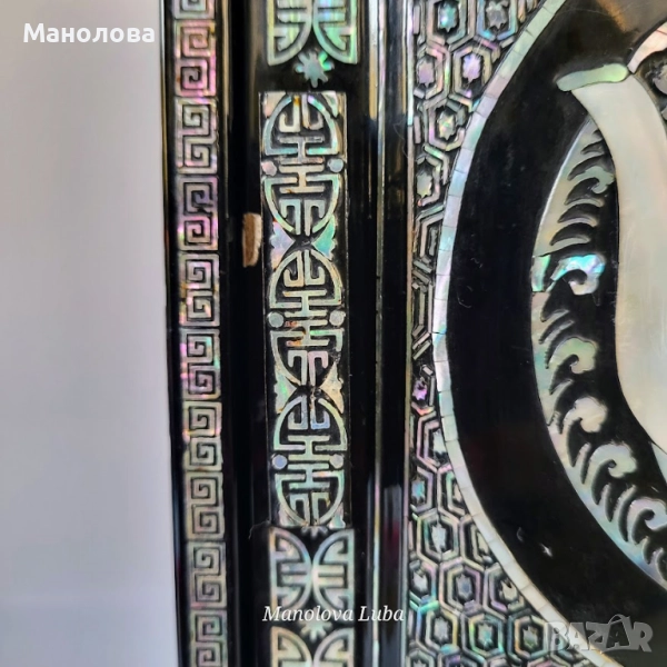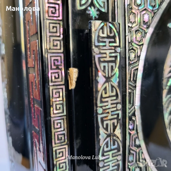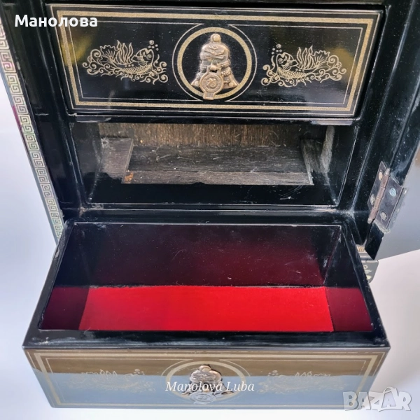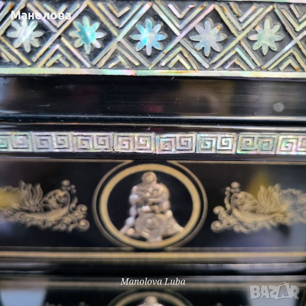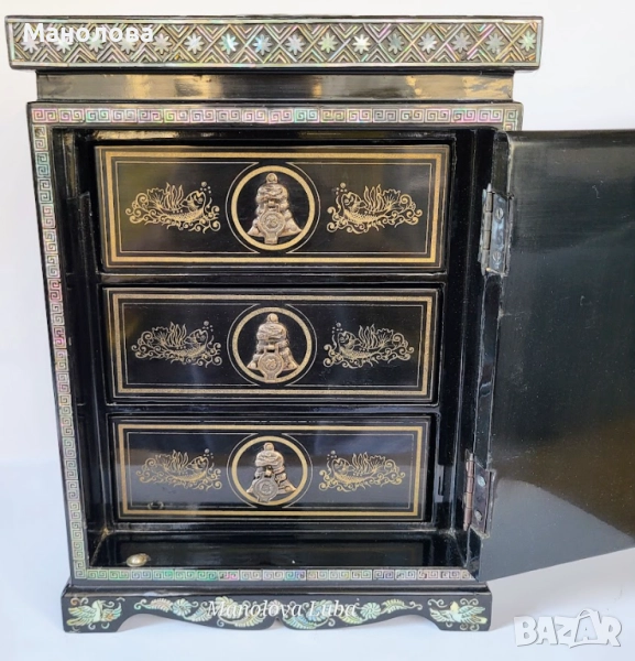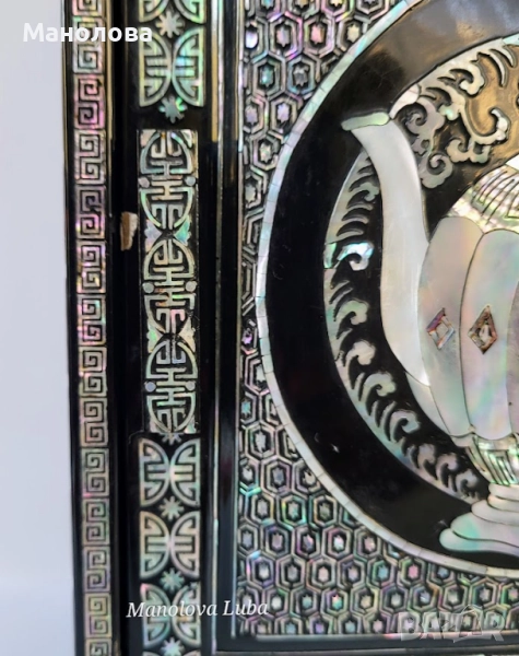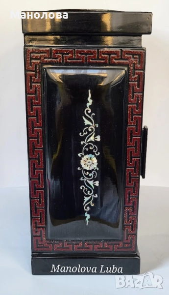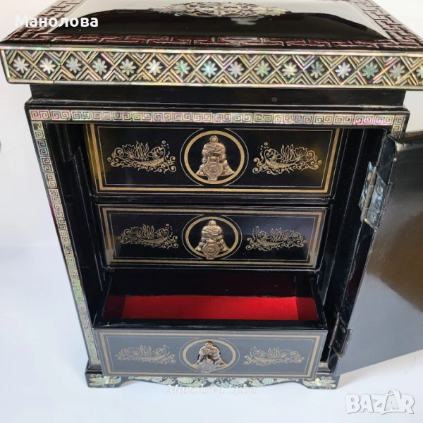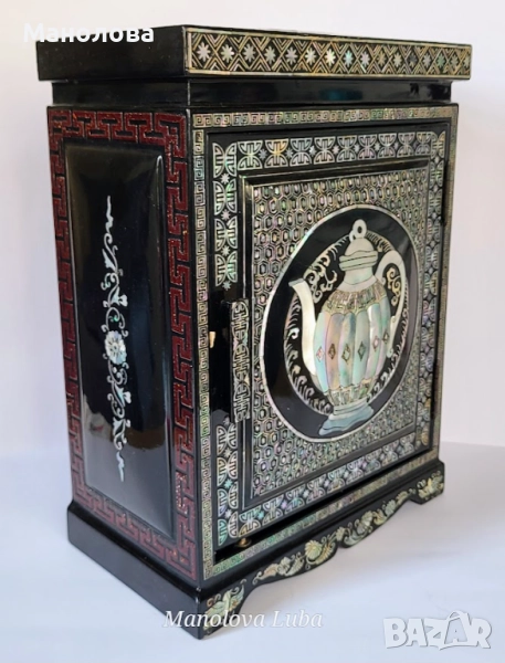 Ръчно изработена, лакирана дървена кутия за бижута със сложна инкрустация от седеф. Предните врати се отварят, за да разкрият три облицовани с червено кадифе вътрешни чекмеджета. Дизайна включва мотиви чайник, геометрични шарки и традиционни орнаменти. Производство 50те години на миналия век. В категория рядък колекционерски артикул. Има две малки забележки видими от снимките!