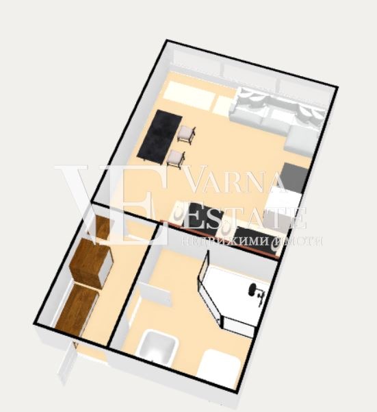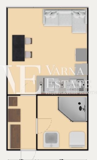 Варна Естейт предлага на Вашето вниманиие обзаведен едностаен апартамент, състоящ се от стая с кухня, коридор и баня с тоалетна. Намира се на предпоследен етаж 4/5 с югозападно изложение. Статут апартамент!