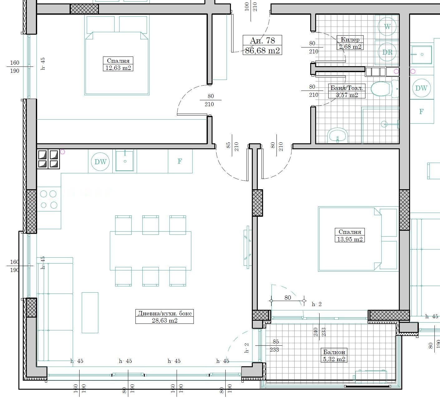 Апартаментът е с обща площ 98 кв.м. и чиста жилищна площ 86.68 кв.м., отличава се с големи прозорци и чудесно изложение на юг и запад, което гарантира светли и топли помещения. Разпределението е функционално и удобно: