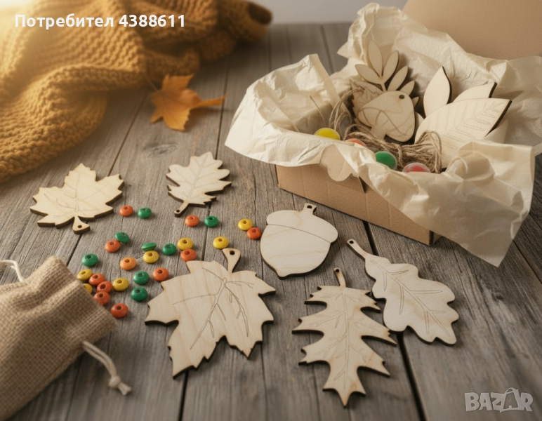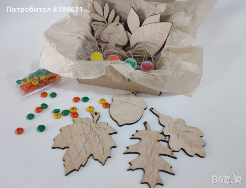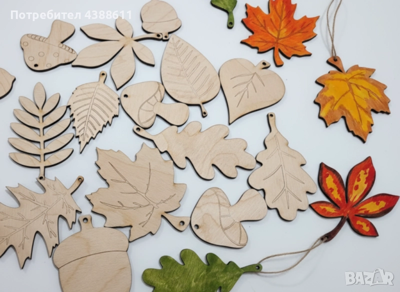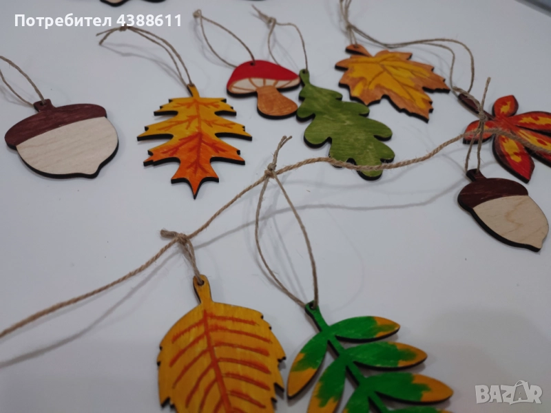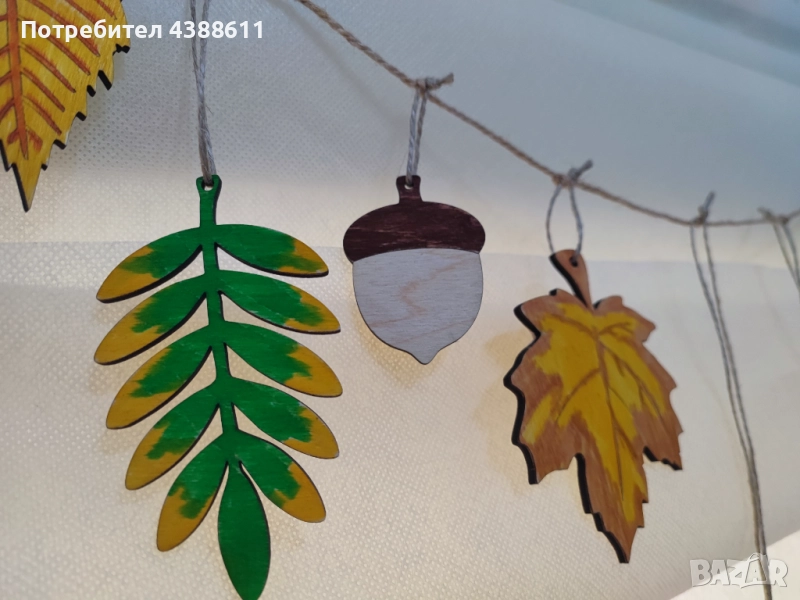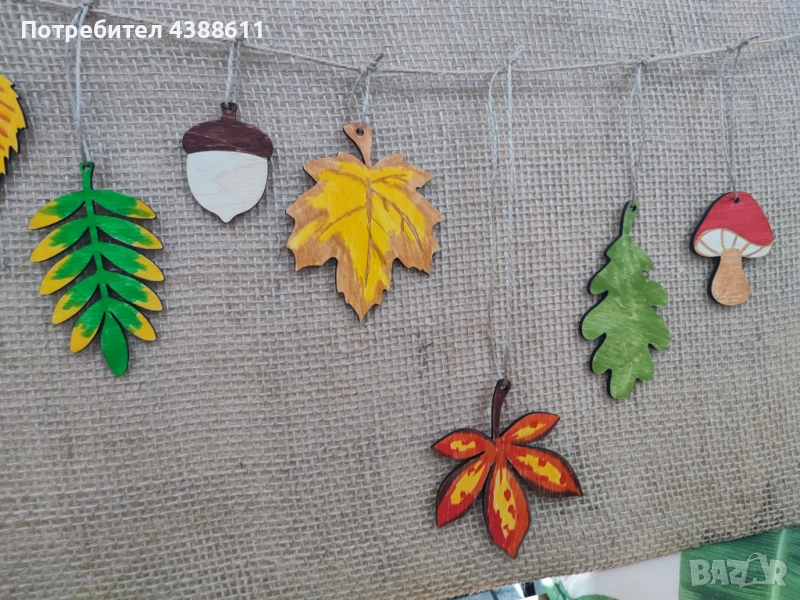 Дървени есенни елементи (листа, жълъди и гъбки), които могат да се оцветят с маркери или с бой и да се закачат с връзки, за да образуват гирлянд от есенни листа.