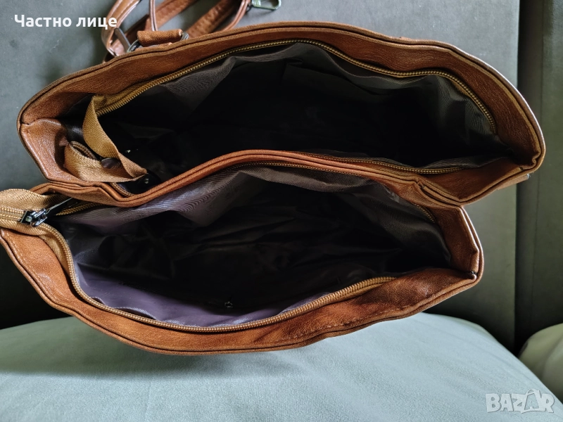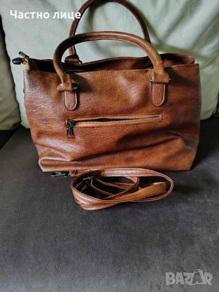 Продавам дамска кафява чанта от еко кожа. Разпределение: 2 прегради, 2 вътрешни джоба и един външен. Има и дълга дръжка за носене през рамо