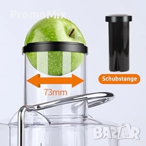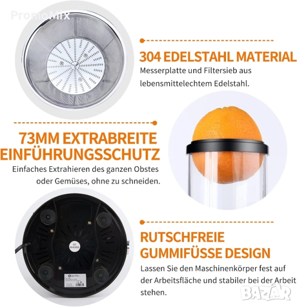 Ножът и фината цедка на сокоизстисквачката са изработени от неръждаема стомана, а отворът за плодове и зеленчуци е с диаметър от 73 милиметра.