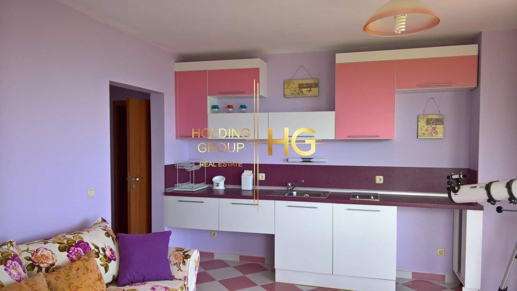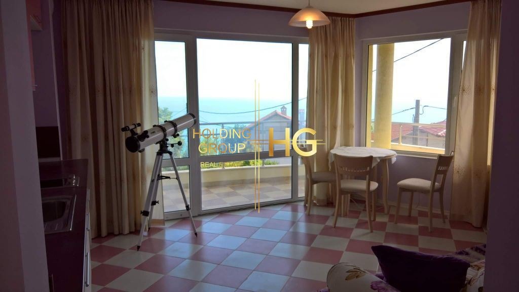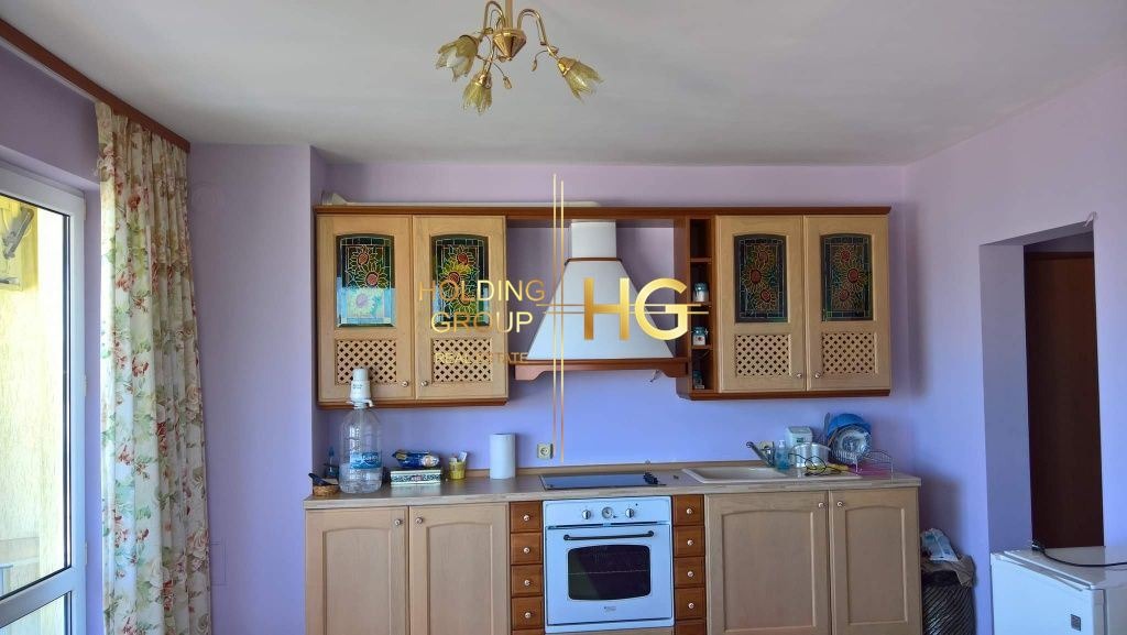 Първият етаж е с огромен хол от 75 кв. м. с кухненски тракт, камина с водна риза и радиатори, спалня с предверие, баня, тоалетна, втора тоалетна за гости, склад. Приземния етаж има зала за фитнес, две стаи, баня, отделна тоалетна. Красива сграда, прекрасен изглед към морето- на двеста метра . Добре поддържан двор, озеленен, 250 корена рози, дървета. Трифазен ток, полива система.