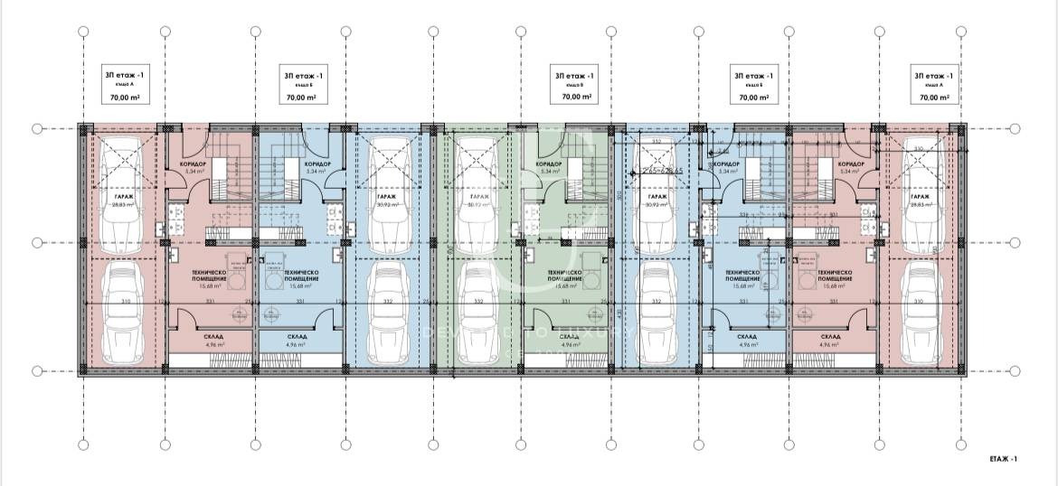Етаж -1- гараж за две коли, склад, техническо помещение и склад;