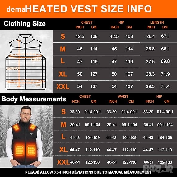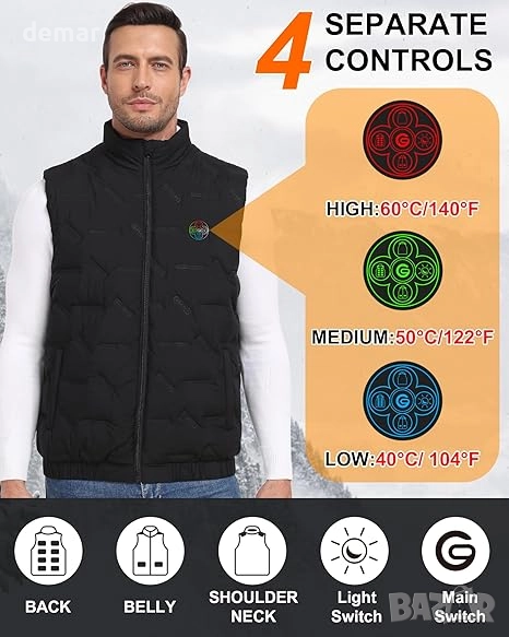 Тази отопляема жилетка разполага с 15 целенасочени зони за отопление по цялото тяло с три регулируеми температурни нива, захранвана от батерия с капацитет 20000 mAh, която осигурява дълготрайна топлина и може да зарежда мобилни устройства. Изработена от издръжлива, ветроустойчива полиестерна външна обвивка, мека подплата и подобрена изолация, тя балансира комфорт, дишане и защита от студ. Интелигентен 4-в-1 превключвател позволява отделно управление на ключовите зони за отопление и функция LED светлина за допълнително удобство. Лека и многофункционална, тя е подходяща за ежедневно носене, пътуване до работа или дейности на открито като туризъм и колоездене, което я прави идеален спътник в студеното време.