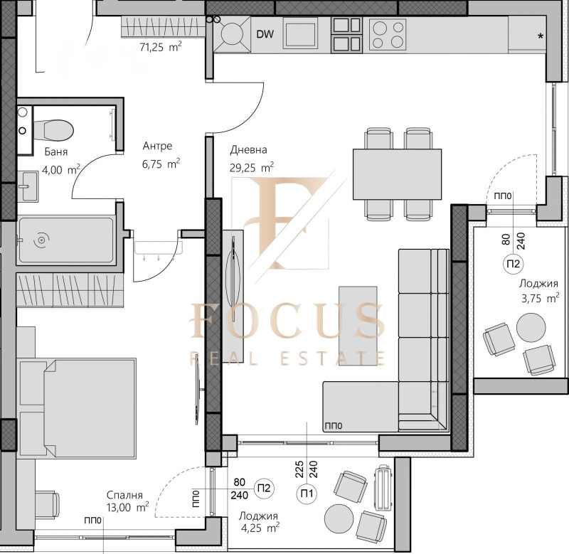 Апартаментът е с обща площ от 89,50 кв.м. със следното разпределение: антре, хол с кухненски бокс, спалня, баня с тоалетна и две тераси.