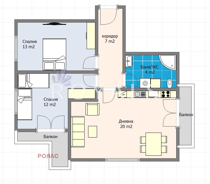 ROYALS Недвижими имоти Ви предлага тристаен апартамент с площ 86,27 кв.м. в новострояща се жилищна сграда в района на Гранд Мол Варна на пети етаж. Жилището е просторно и добре оганизирано и се състои от дневна с кухня и трапезария (20кв.м) с тераса към нея, първа спалня(12кв.м), втора спалня (13кв.м) с тераса към нея, комбиниран санитарен възел, входно антре с предвидено място за гардероб.
