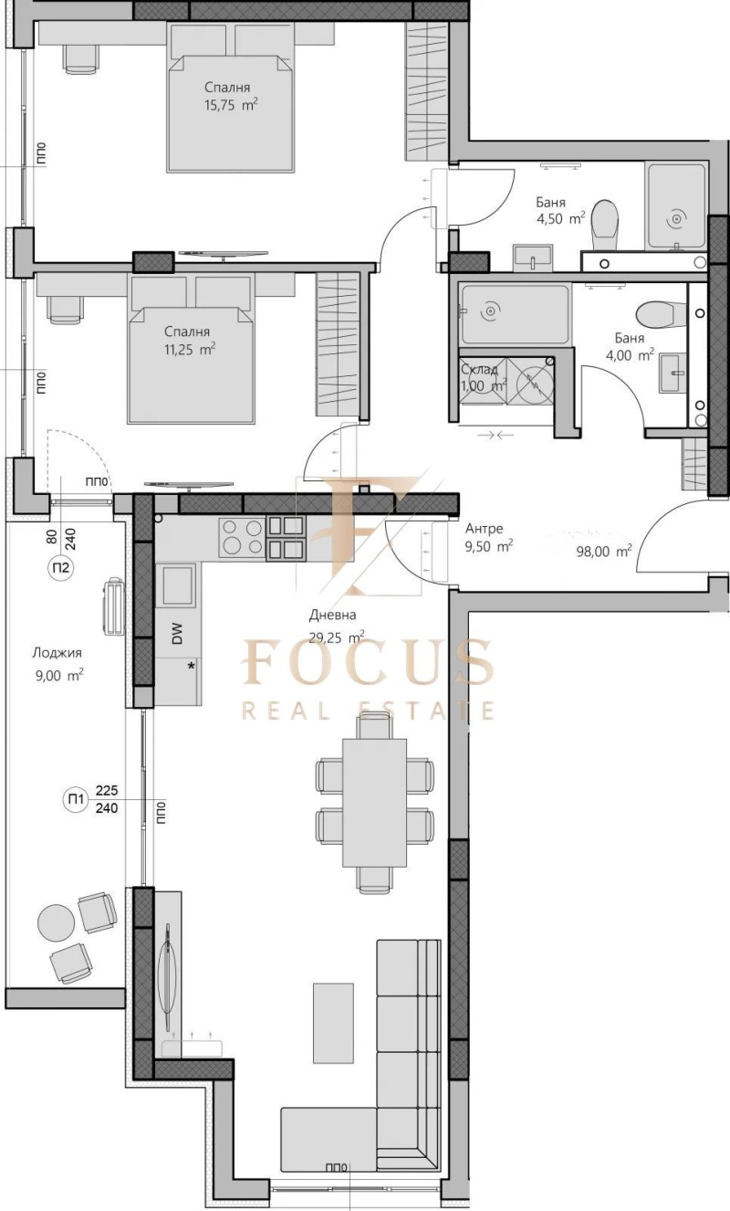 Апартаментът е с обща площ от 115,98 кв.м. със следното разпределение: антре, хол с кухненски бокс, две спални, баня с тоалетна, отделна тоалетна, склад и тераса.