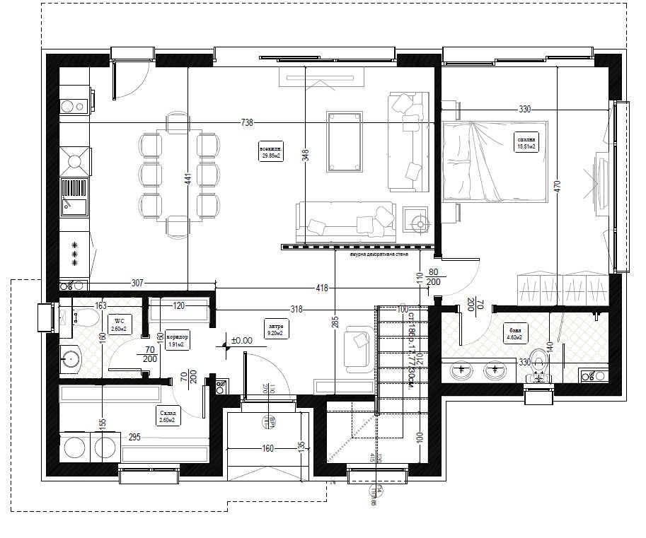 1-ви етаж: просторна дневна с кухня, баня/WC, веранда.
