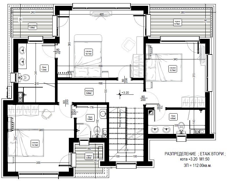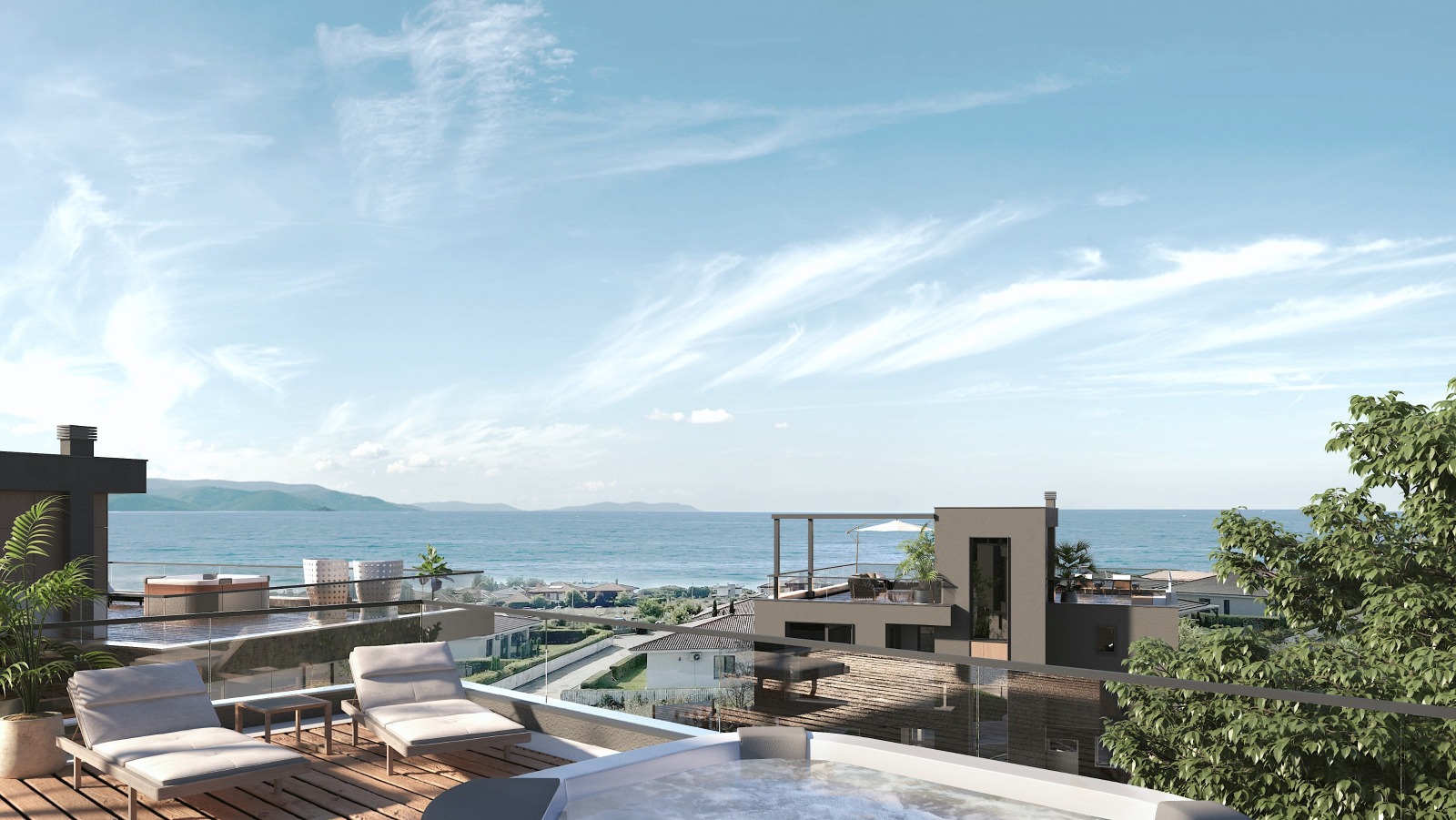 2-ри етаж: 3 спални, 3 бани, 3 тераси с фронтална морска гледка.