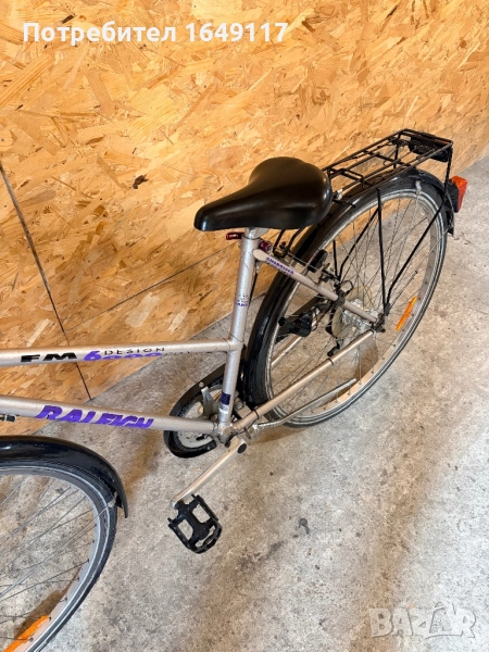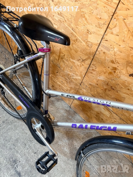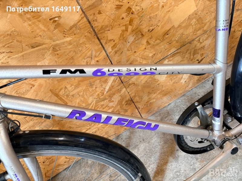 Продавам 28цола, съвсем малко употребяван дамски-градски велосипед Raleigh FM 6000[hand made in Nottinghan/England]. Олекотена, тънкостенна рамка - 46см[стлобка на муфи]. Външни скорости SACHS 3000 - 21бр. c палцови команди SACHS Pro със заключване. Алуминиеви курбели. Ергономична седалка Pioneer Gel с алуминиево колче. Алуминиеви капли, и гуми Schwalbe Smart guard Marathon plus с усилен профил. Предна и задна кантарни спирачки. Кормило с алуминиева лапа.