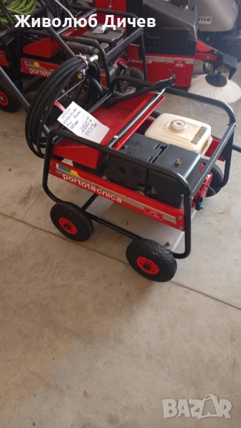 Професионална италианска бензинова водоструйка Portotecnica. Оригинален четиритактов бензинов двигател Honda GX340 - 11 к.с , помпа за високо налягане Interpump, с максимално работно налягане 190 бара и дебит 18 литра в минута. Машината е обслужена и профилактирана, сменени са всички консумативи и работи перфектно. Перфектно състояние. Продава се комплект с 10 метра маркуч и пистолет.