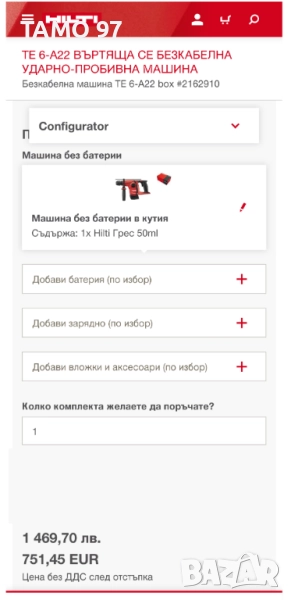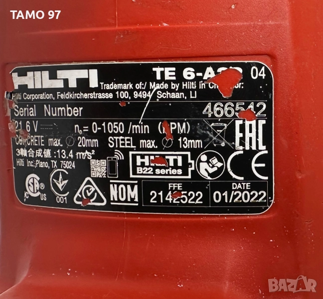Хилти със запазен външен вид, също така работи и функционира отлично, без никакви забелеки, производство от 2022г. внос от Франция. Обявената цена е за само боди без батерии и зарядно. При желание на клиента може да се окомплектова с 2 батерии по 5.2Ah и зарядно за 950лв. Пращаме с опция преглед и тест с куриерска фирма еконт, може и лично предаване за гр. Шумен.