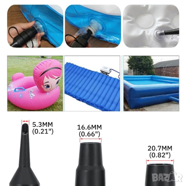 – Включени 3 адаптера – съвместими с различни видове надуваеми продукти