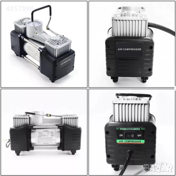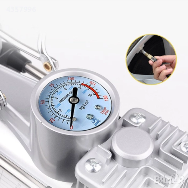компресор с манометър и спираловиден маркуч, осигуряващ много бързо помпене на гуми на автомобили и различни надуваеми продукти като лодки, дюшеци, басейни, топки и др.