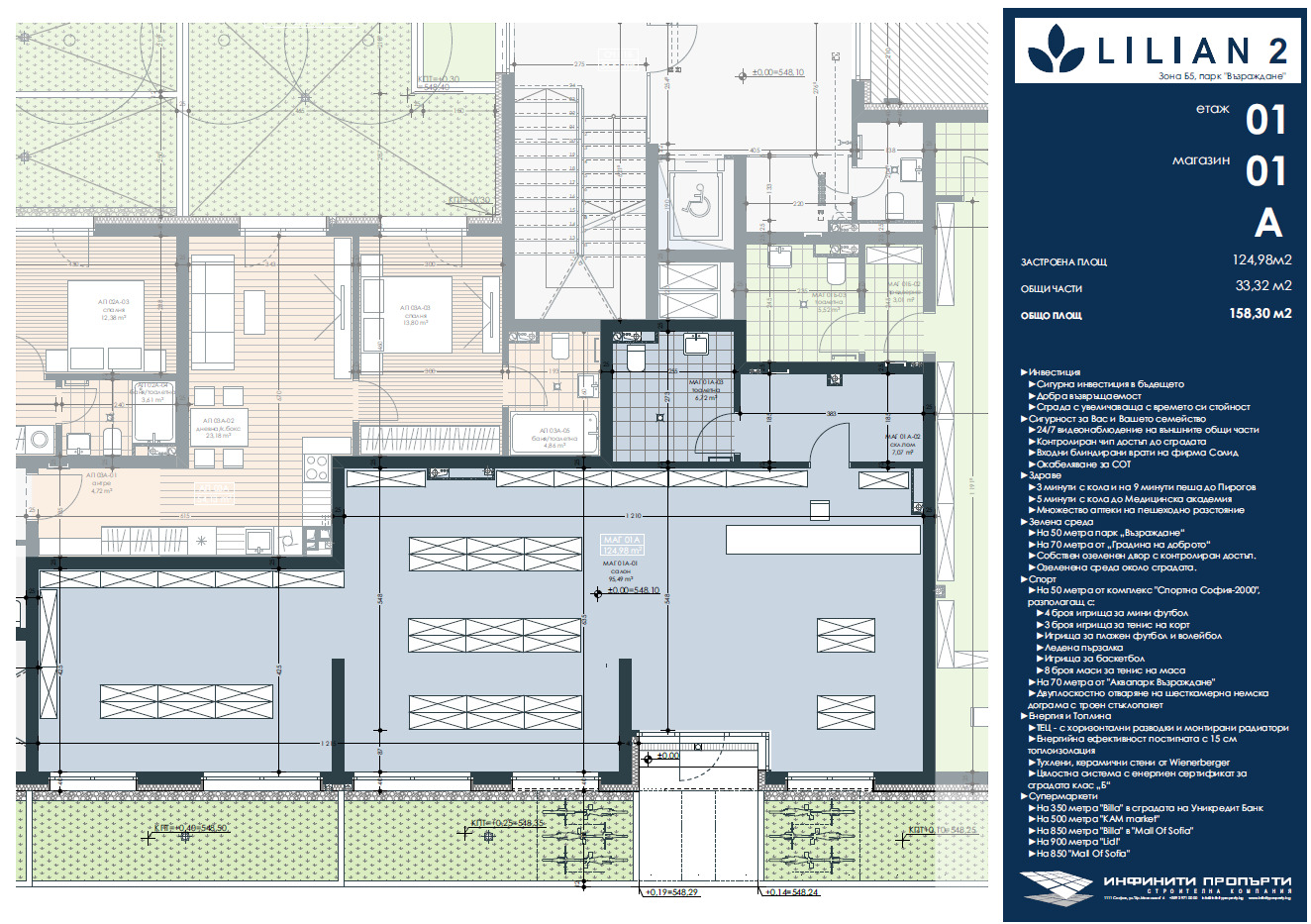МАГАЗИН 01А се състои от едно голямо търговско помещение с витрина, около 17м. и източно изложение.