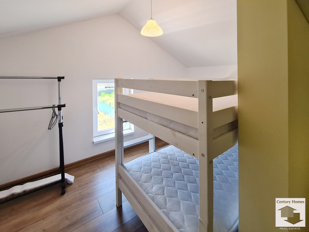 Къщата се простира върху 160 кв. м. жилищна площ разпределена на два етажа и включва входно антре, просторен коридор, който води към дневна и трапезария. Срещу трапезария се намира напълно обзаведена кухня с мокро помещение и изход към задния двор. В края на коридора има тоалетна и дървени стълби, които водят до втория етаж. Горе има широк коридор, панорамна тераса с гледка към двора и две спални, една от които е със собствен санитарен възел и гардеробна, а втората е с две гардеробни.