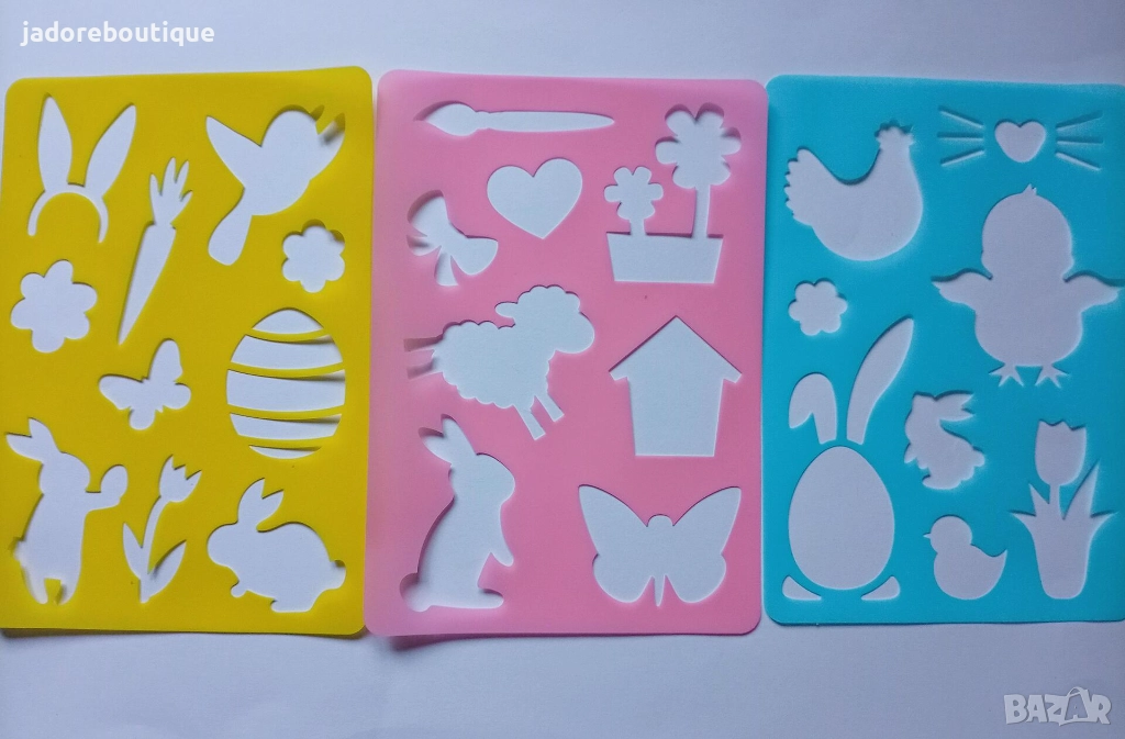 Комплектът съдържа 3 броя шаблони с великденски мотиви, и 4 броя тебеширени маркери в пролетни пастелни цветове.