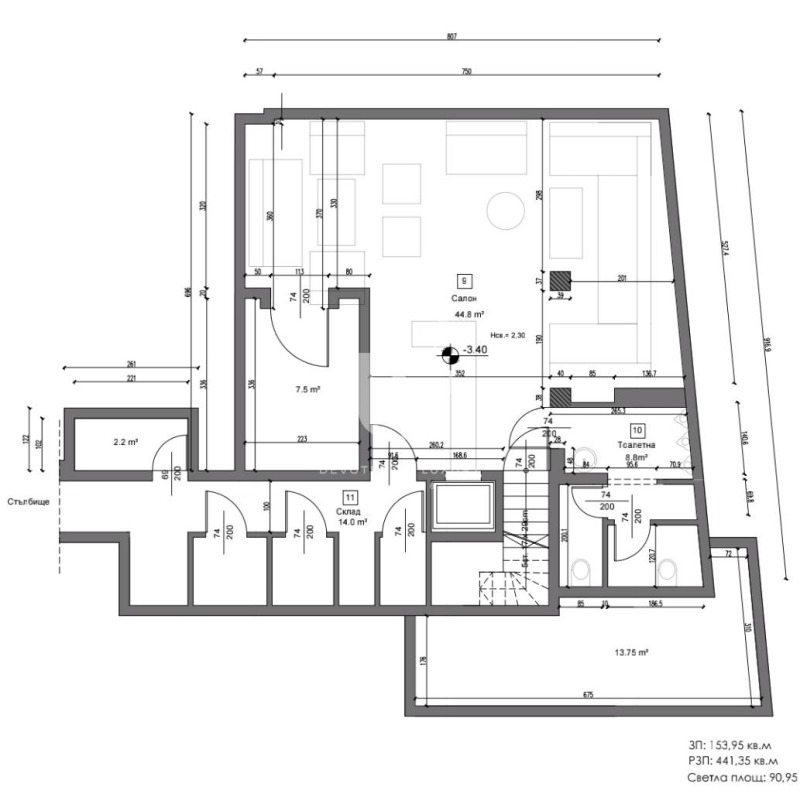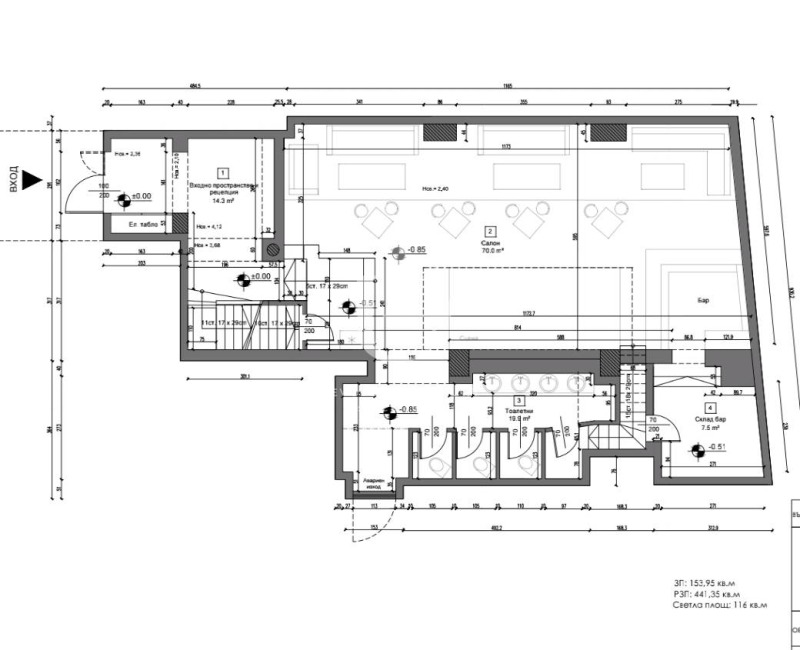 Имотът разполага с просторна зала, включваща обособена зона за бар и места за клиенти на две нива. Подземното ниво предлага пространство за кухня с възможност за вътрешен асансьор или допълнителна зала за гости, а санитарните възли са предвидени както за клиенти, така и за персонала. В имота е включен офис с излаз към покривна тераса, а складовото помещение е удобно интегрирано в обслужващата зона за максимална ефективност. Вторичен коридор свързва обслужващи помещения, а служебният вход и зона за зареждане. Ref. ID:26595