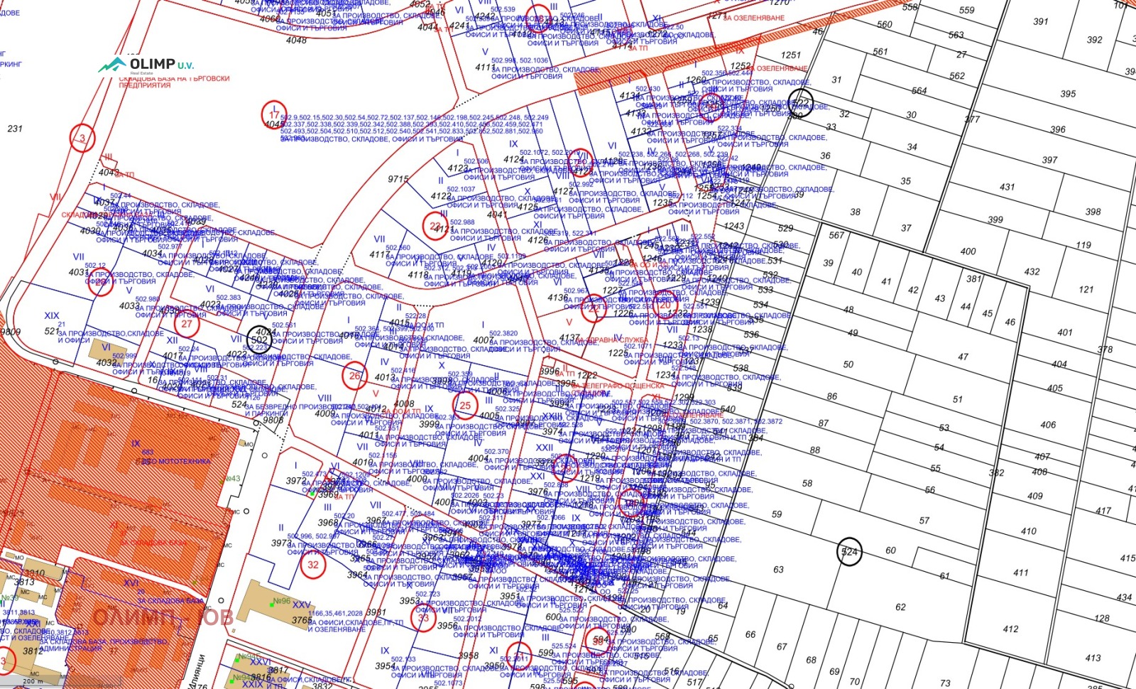 Урегулиран поземлен имот, намиращ се на 200 метра от бул. Илиянци . Регулационната зона, в която е отреден е Птп за високотехнологични производства, с параметри на застрояване плътност: 30%; кинт. 1.2. За парцела има влязло в сила градоустройство за складово помещение.