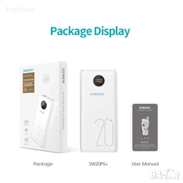 Какво получавате: Външна батерия ROMOSS SW20PF 22,5&PD20W 20 000 mAh, ръководство за потребителя, 12-месечна гаранция и приятелско обслужване на клиентите. (Забележка: Кабелът за зареждане НЕ е включен.)