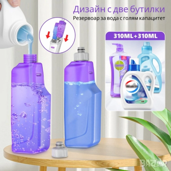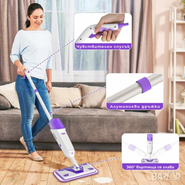 Тип: Спрей моп с двоен резервоар Капацитет на бутилките: 2 × 310 мл (общо 620 мл) Материал на дръжката: Алуминий Въртене на главата: 360° Спрей механизъм: Чувствителен спусък с равномерна фина мъгла Подложки: 3 броя, многократни, подходящи за пране Подходящ за: твърда дървесина, ламинат, цимент, камък, стъкло, бамбук Тегло: лек и удобен за ежедневна употреба Размери: стандартни за домашно почистване