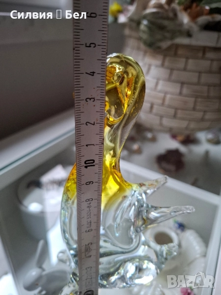 кехлибарено/златисто жълто в горната част и главата. Жълтият цвят е "уловен" вътре в прозрачното стъкло, което придава дълбочина и блясък. Напомня изработката на прочутото Мурано стъкло от Венеция, известно с изящните си анималистични фигурки и живописните цветове, въведени в масата на стъклото. Размери: Височина: Около 14,5см. Отлично допълнение към всяка колекция от арт стъкло или животински фигурки. Играта на светлината през стъклото и кехлибарения цвят създава топъл и луксозен ефект. Състояние: Отлично, без забележки. Цена: 7️⃣5️⃣лв.(38,34 €) •✽✧✽•°”˜🦋”°•✽✧✽•°”˜🦋”°•✽✧✽•°”˜🦋”°•✽✧✽•°”🦋˜”°•✽✧✽•