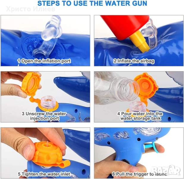 - 【Надуваем и лесен за употреба】-- Нашата играчка воден пистолет е с форма на син анимационен крокодил, а тялото на пистолета е с уникален дизайн на предпазен клапан за надуване от най-високо ниво. Лесен е за надуване и употреба. Напълнете резервоара на водния пистолет с вода (около 250 мл), след което натиснете спусъка и можете лесно да стреляте. Водният пистолет може да пръска вода на разстояние от 6,7 до 12,7 метра, което позволява на децата ви да се насладят на безкрайното забавление от водната битка.
