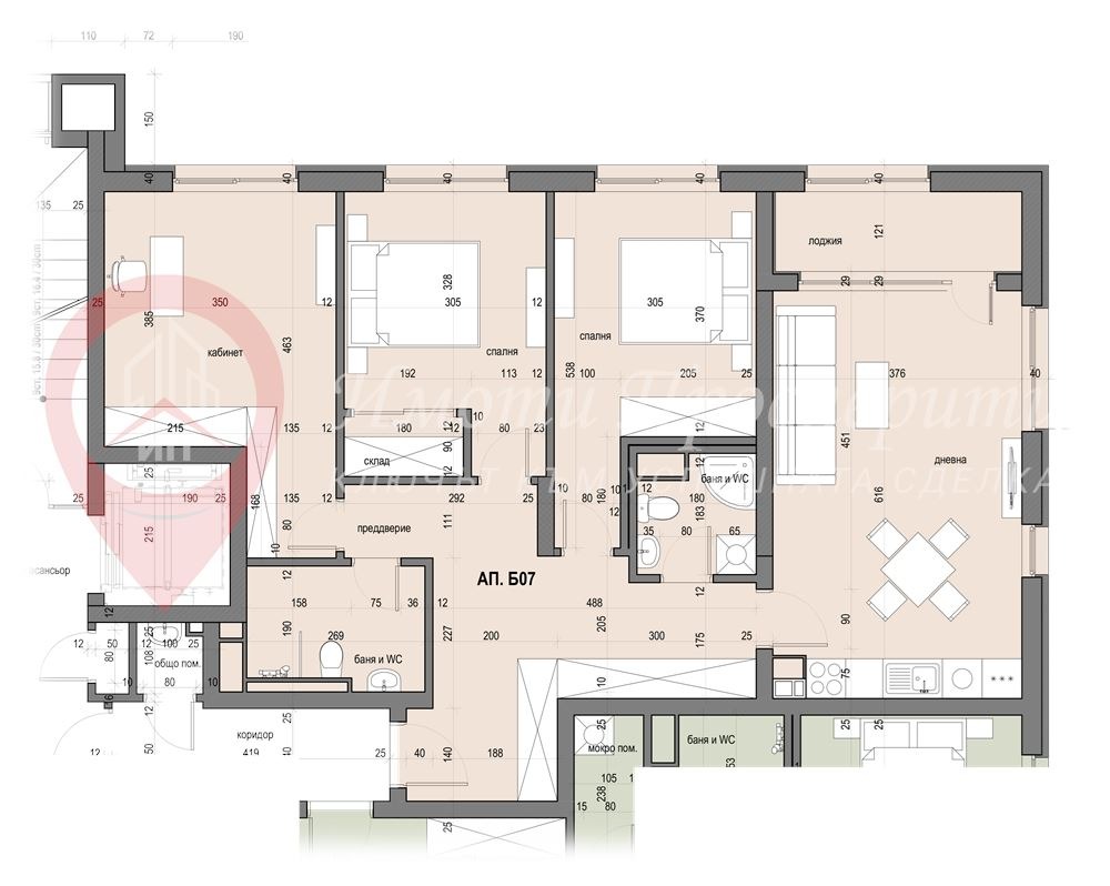 Разпределение: антре, дневна с трапезария и кухненски бокс, 2 спални, кабинет, склад, 2 бани с тоалетни и тераса.