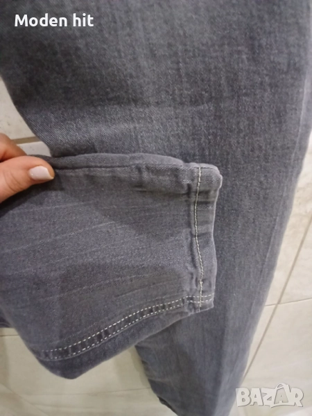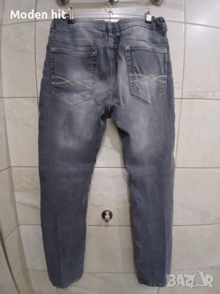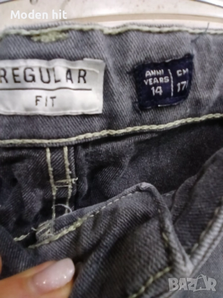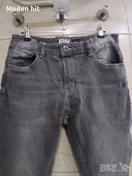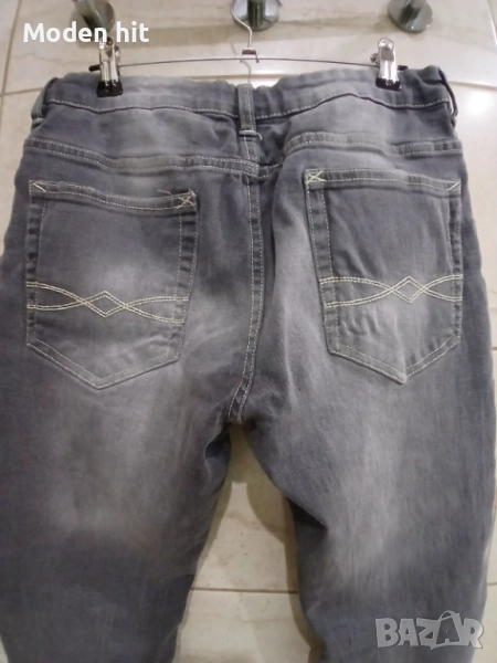 Сиви дънки за тийнеджър. Еластични. С ластик и копчета за корекция на талията. По етикет са размер 170 см./14 години. Дължина 98,5 см., от чатала 75 см. Талия дностранно 35,5 /може да се намали с ластика и копчетата/, разтяга се до 43,5 см. Ханш едностранно от 47,5 до 57,5 см. Отлични, без забележки.